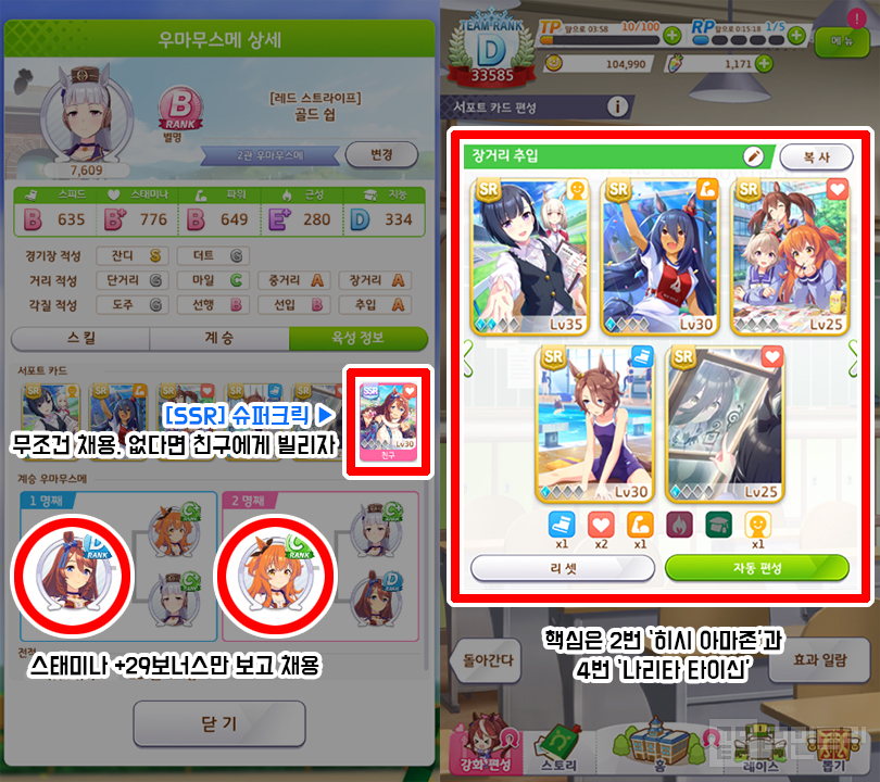 서포트 카드는 ‘슈퍼 크릭’이 필수다. 상한돌파를 못 해도 상관없으니 친구에게 빌려오자. 이것 하나만 있으면 육성이 아주 편해진다. 두 번째로 추천하는 건 SR등급 ‘히시 아마존’이다. 초기 우정도 및 파워 증가 보너스가 있고 추입마 전용 스킬을 4개 갖고 있다.