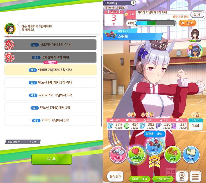 이번 공략에서는 레이스에 많이 참여해 시니어급 2월 전반에 팬을 11만 명 이상 모았고, 꾸준히 스킬 포인트를 쌓을 겸 레이스를 돌아 시니어급 12월 후반에 약 17만 명을 달성했다. 그 덕분에 마지막 레이스인 ‘아리마 기념’에 고유 스킬 레벨 4를 달성한 상태에서 참여할 수 있었다. 여기까지 왔다면 더는 레이스를 뛸 필요는 없으니 트레이닝에 전념한다.