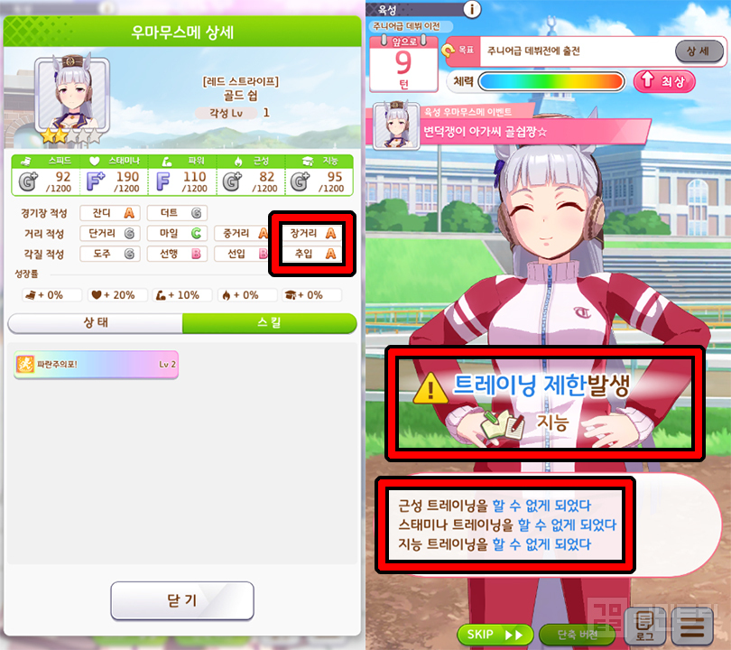 훈련 종목은 근성을 제외한 우정 트레이닝 위주로 고르되, 부족한 스탯이 있다면 집중 훈련을 추천한다. 평소보다 성장폭이 큰 만큼, 그동안 발목을 잡던 스탯을 해결하기 좋다. 육성 목표 레이스를 시작하기 전 ‘예상’ 버튼을 눌러보면 도움이 된다. 어떤 스탯이 부족한지 조언해주고, 이에 기반해 스탯을 찍으면 된다.