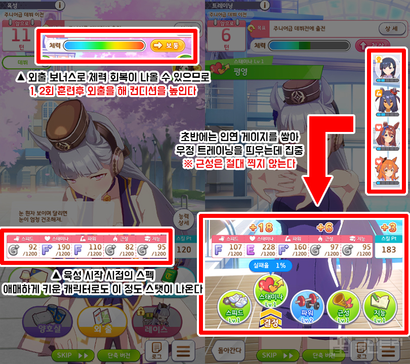간단한 설명을 마쳤으니 본격적인 육성 루트를 알아보자. 최저 투자로 우마뾰이를 보기 위한 전략은 이렇다. 체력을 최대한 활용하기 위해 인연 게이지를 빠르게 모으고, 중후반에 우정 트레이닝을 띄워 스탯을 골고루 높인다. 이 때문에 초반에는 스탯 부족으로 경기에서 1착을 못할 때가 많다. 어차피 최저 컷이 목표이니 후반을 생각하며 무시하자.