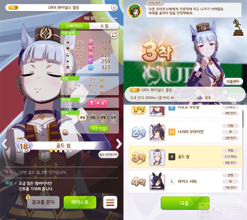 이때 준결승 승부 예상을 보고 마지막 훈련을 스피드에 쏟는 건 추천하지 않는다. 골드 쉽은 막판 대역전을 노리는 추입마고, 파워가 부족하면 스피드를 온전히 발휘할 수 없다. 따라서 가능하면 아리마 기념을 전후로 ‘스피드 600 – 스태미나 700 – 파워 600’을 미리 찍어두고, URA 기간에는 파워를 올인하는 것이 베스트다.