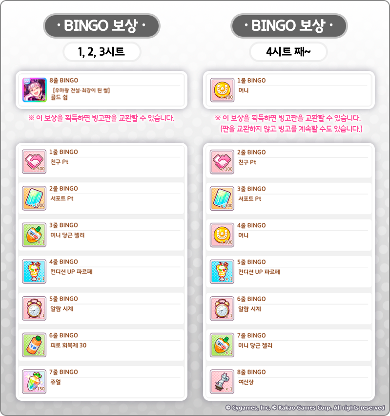 완성한 줄 개수에 따라 아래와 같은 BINGO 보상을 획득할 수 있습니다.