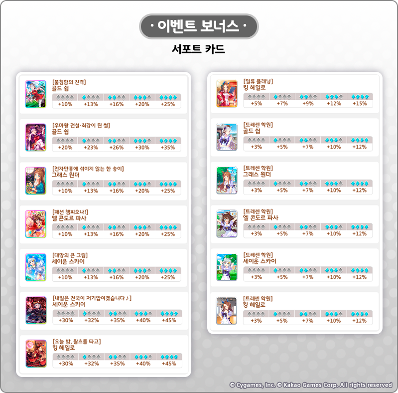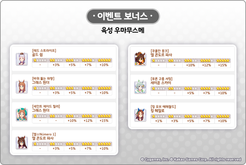 - 이벤트 보너스 육성 우마무스메와 이벤트 보너스 서포트 카드는 이벤트 기간 중 추가될 수 있습니다.
