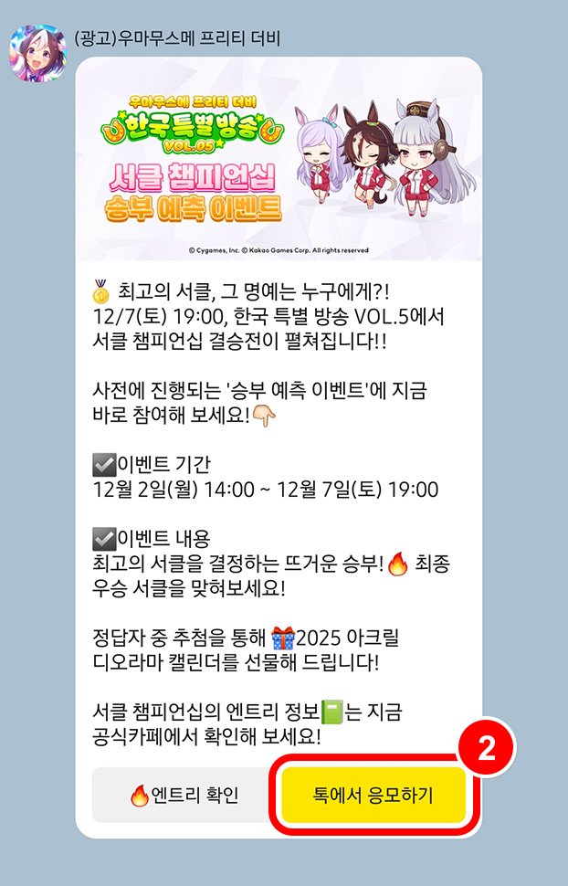 * 승부 예측 이벤트는 <우마무스메 프리티 더비> 카카오톡 채널 추가 후 참여할 수 있습니다.