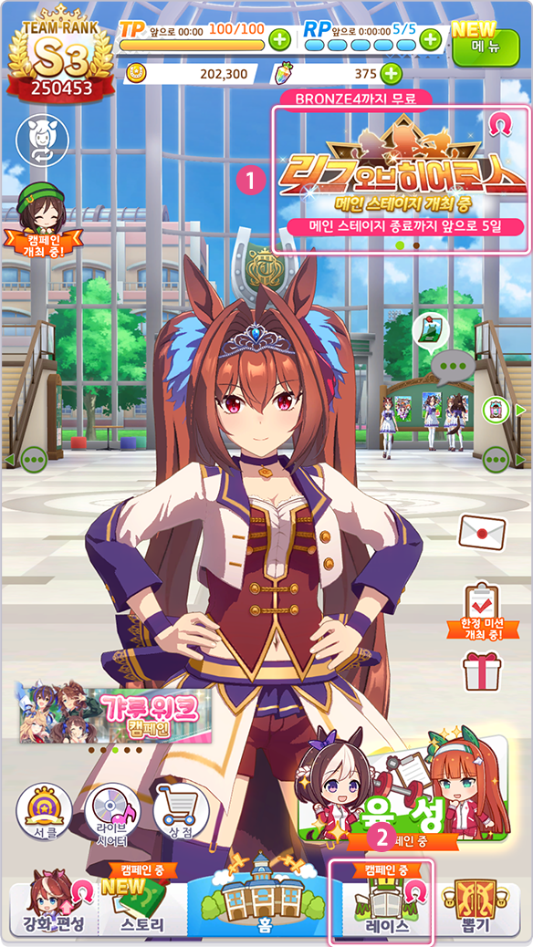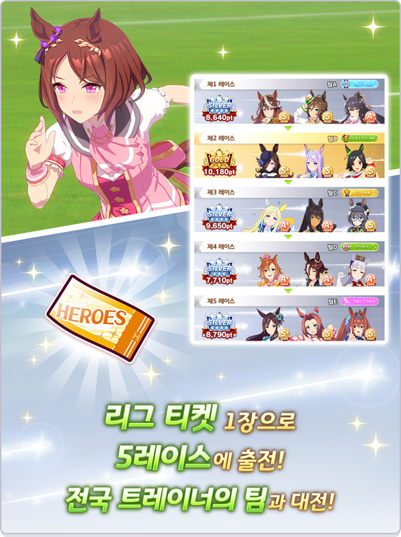 [리그 오브 히어로스]는 3명의 전당 입성 우마무스메로 팀을 편성해 전국의 트레이너 팀과 대전하는 레이스 이벤트입니다.