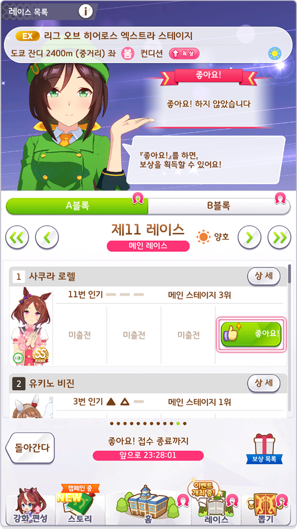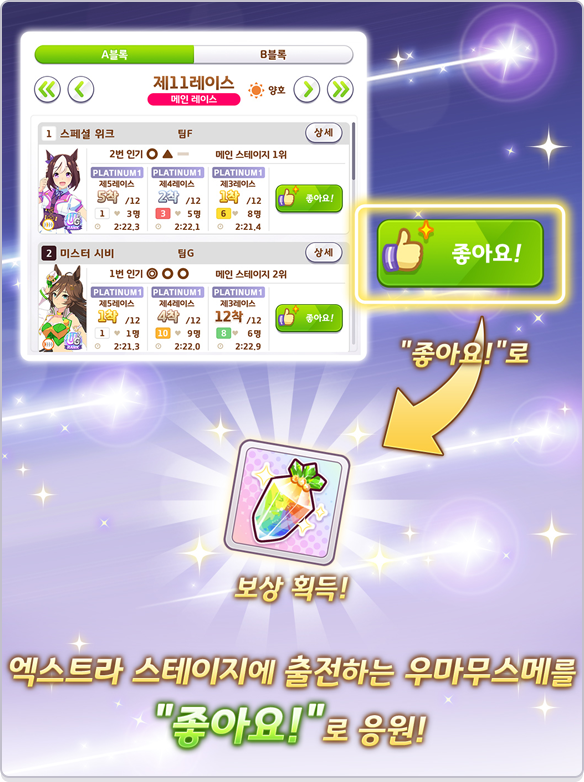 * 좋아요! 접수 기간에 「좋아요!」로 출전 우마무스메를 응원하면 「좋아요! 보상」 획득 가능(A/B 블록 각 1회)