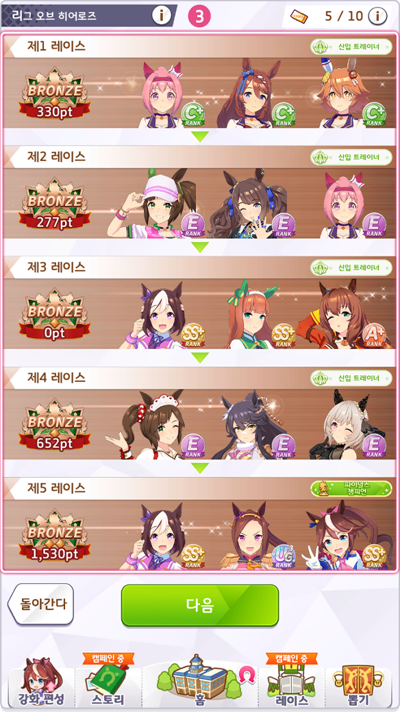 - 5 레이스는 1 레이스당 총 12명의 우마무스메 출전(상대 팀 3명, NPC 팀 6명)