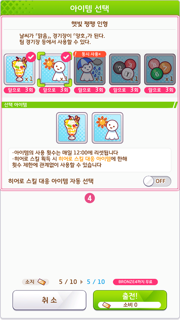 * 히어로 스킬 대응 아이템 자동 선택을 [ON]하면 별도로 선택하지 않아도 자동으로 사용됩니다.