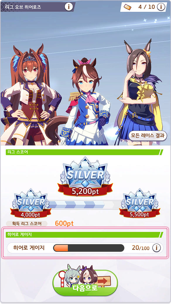 - 레이스에 출전하면 착순에 따라 히어로 게이지가 모이며, 리그 랭크가 SILVER1에 도달할 경우 MAX가 됩니다.