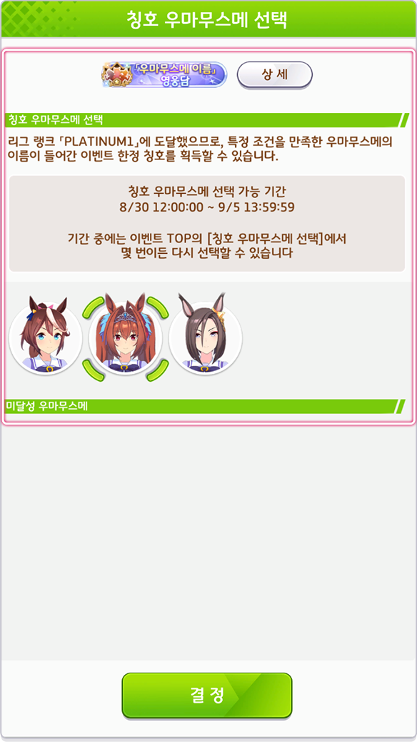 * 메인 스테이지의 랭킹 집계 기간까지, 이벤트 TOP의 [칭호 우마무스메 선택]에서 선택을 변경할 수 있습니다.