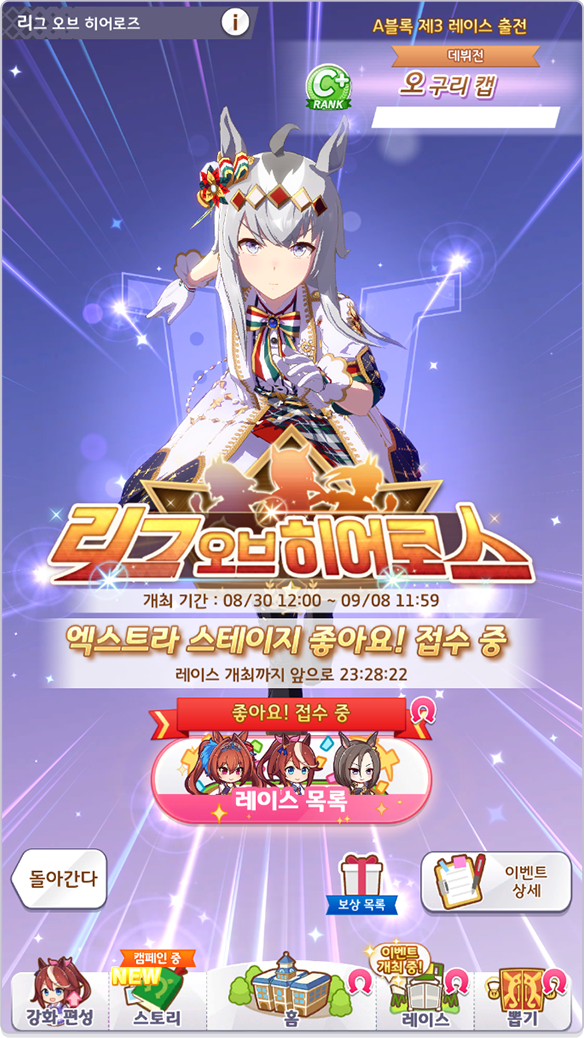 엑스트라 스테이지 개최 기간에 리그 오브 히어로스로 이동하면 자동적으로 메인 레이스가 재생됩니다.