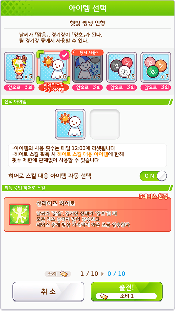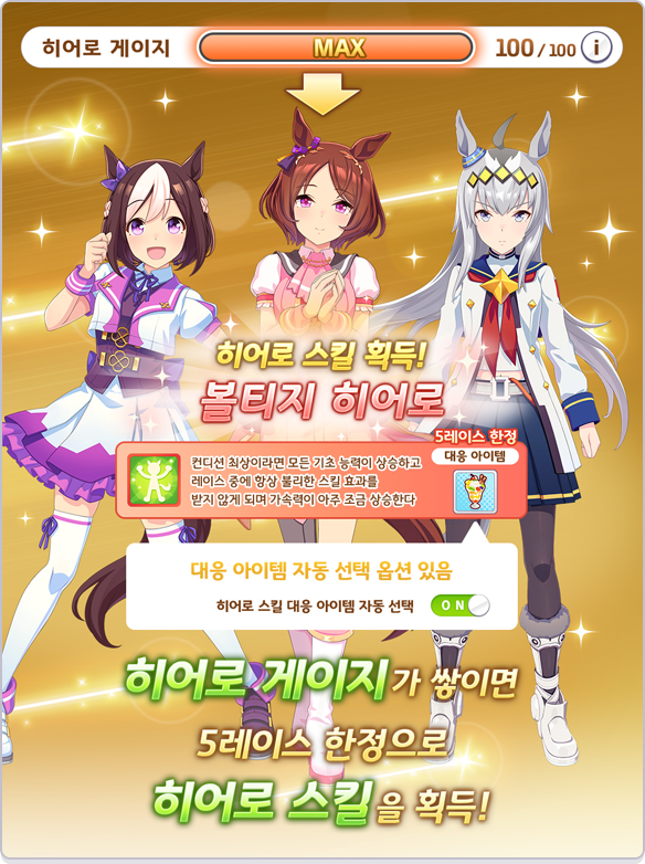 - 히어로 게이지가 MAX가 되면 5 레이스 한정으로 획득하는 스킬로, 5 레이스 종료 후에 사라집니다.