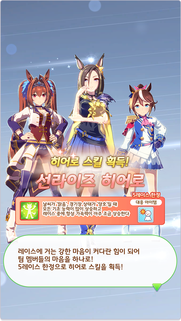 | 선라이즈 히어로 | 날씨가 '맑음', 경기장 상태가 '양호'일 때 모든 기초 능력이 많이 상승하고 레이스 중에 항상 가속력이 아주 조금 상승한다 |