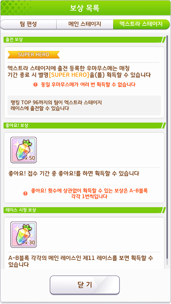 * 엑스트라 스테이지 출전 우마무스메는 한정 별명 [SUPER HERO] 획득