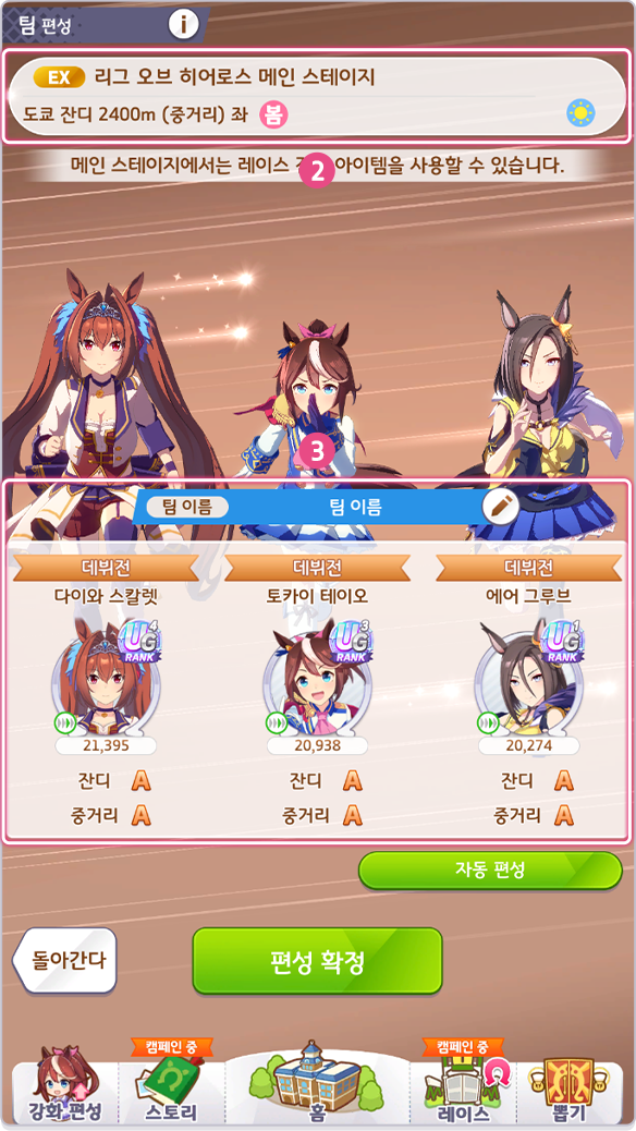 ③ 3명의 전당 입성 우마무스메로 [팀 편성]을 진행하거나 [팀 이름] 변경 가능