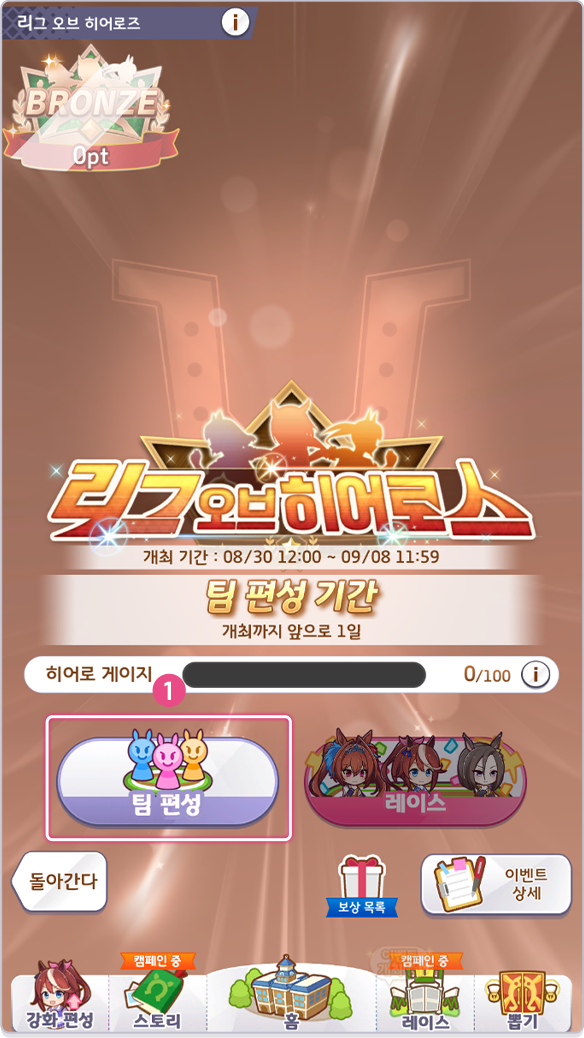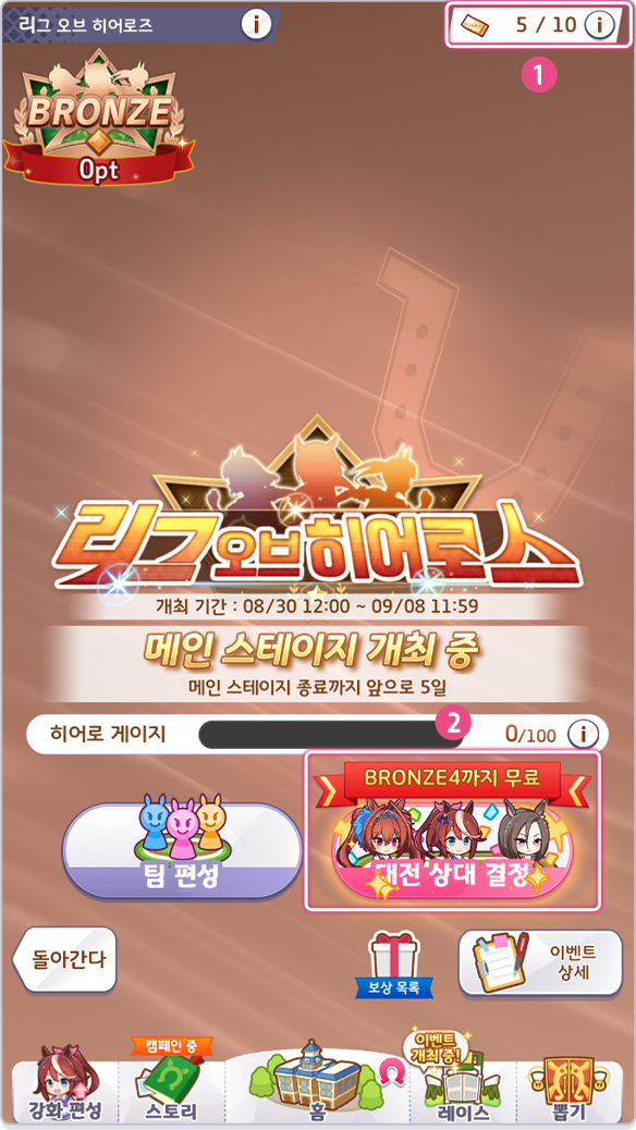 이벤트 TOP 화면에서는 팀 편성 및 레이스 출전이 가능하고 히어로 게이지, 보상 목록, 이벤트 상세 정보 등을 확인할 수 있습니다.