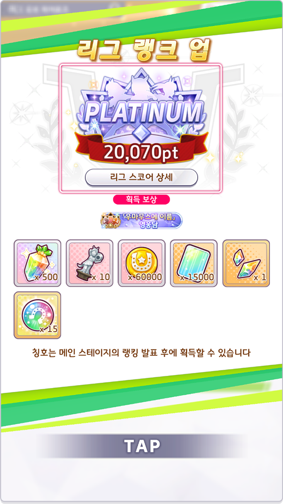 - 리그 랭크 PLATINUM1에 도달하면 우마무스메의 이름이 적힌 이벤트 한정 칭호 「영웅담」을 획득할 수 있습니다.