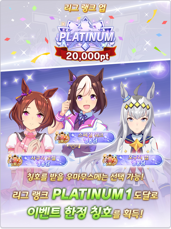 * 리그 랭크 PLATINUM1을 달성하면 우마무스메의 이름이 기재된 한정 칭호도 획득 가능!