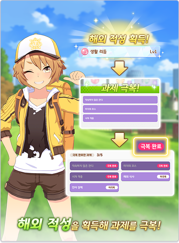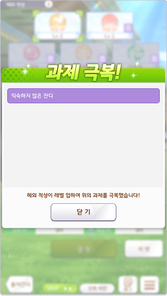 과제는 그에 대응하는 [해외 적성]의 [적성 Lv]을 레벨 업하여 극복할 수 있습니다.