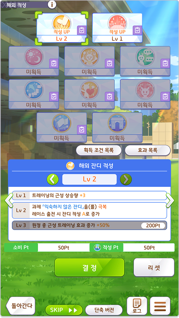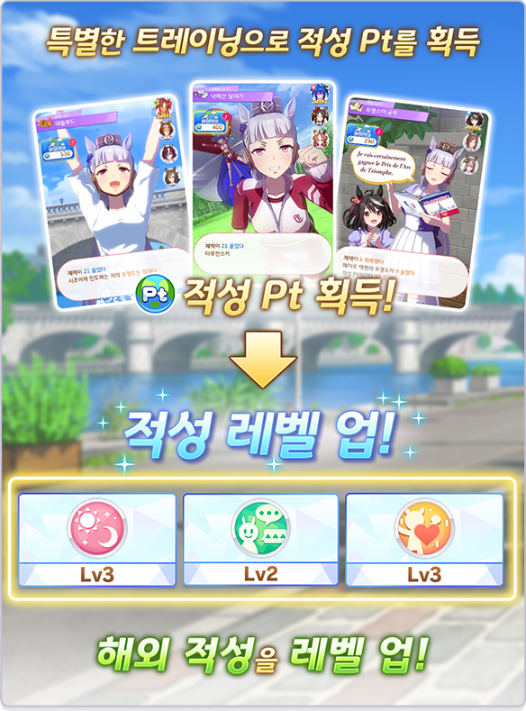 「적성 Lv」을 올려 과제 극복이나 레이스 출전 시 능력 상승 등 다양한 효과를 받을 수 있습니다.