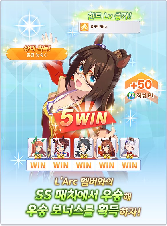 육성 중 총 4회 개최되는 「L'Arc 대표 교류전」은 L'Arc 멤버 대표와 해외 우마무스메가 출전하여 교류하는 레이스입니다.