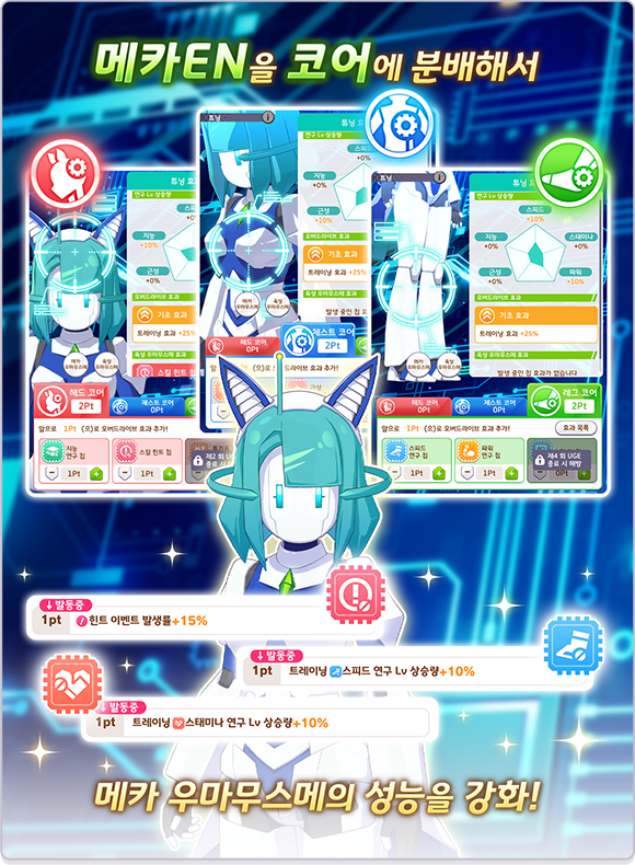 『메카 우마무스메』에는 헤드, 체스트, 레그의 3종류 코어가 있고 칩에 메카EN을 할당하면 코어를 강화할 수 있습니다.