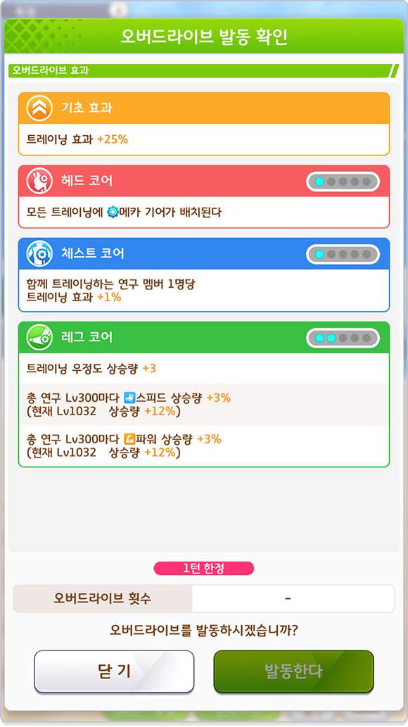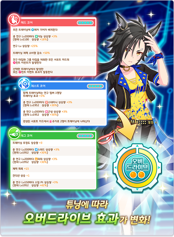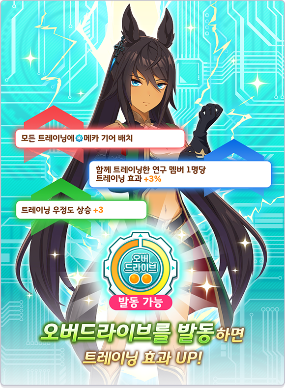* 「메카 기어」가 배치되어 있는 [트레이닝], [레이스], [휴식], [외출], [양호실]을 진행하면 오버드라이브 게이지가 상승합니다.