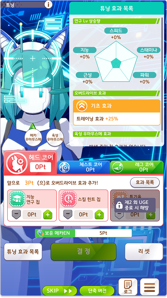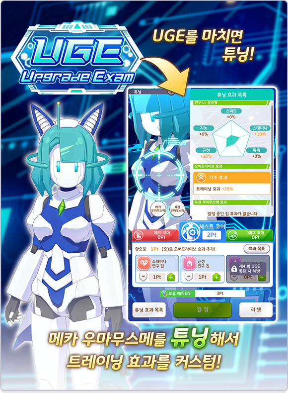 * 육성 시작 직후의 특정 턴과 UGE 종료 후에 메카 우마무스메의 튜닝을 진행합니다.