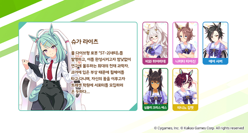 「달려라! 메카 우마무스메 -꿈을 잇는 발명-」의 '주요 캐릭터'와 '시나리오 링크 캐릭터'를 소개합니다.