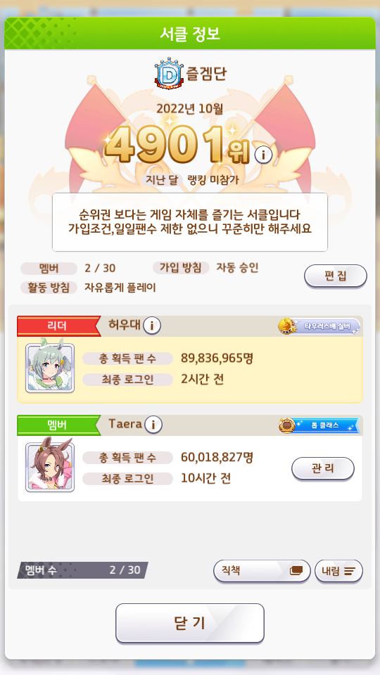 [모집]즐겜단에서 같이 즐겜하실 분 구해요~ (2/30) 작성자hoo9030|작성시간22.10.01|조회수62 목록 댓글 0 글자크기 작게가 글자크기 크게가 신생서클 입니다순위권 보다는 게임 자체를 즐기고 싶은 유저분들 누구나 환영합니다가입제한 일일팬수 제한 없으니 꾸준히만 해주시면 됩니다 다음검색 현재 게시글 추가 기능 열기 북마크 공유하기 신고 센터로 신고 댓글 댓글 0 댓글쓰기 답글쓰기 댓글 리스트