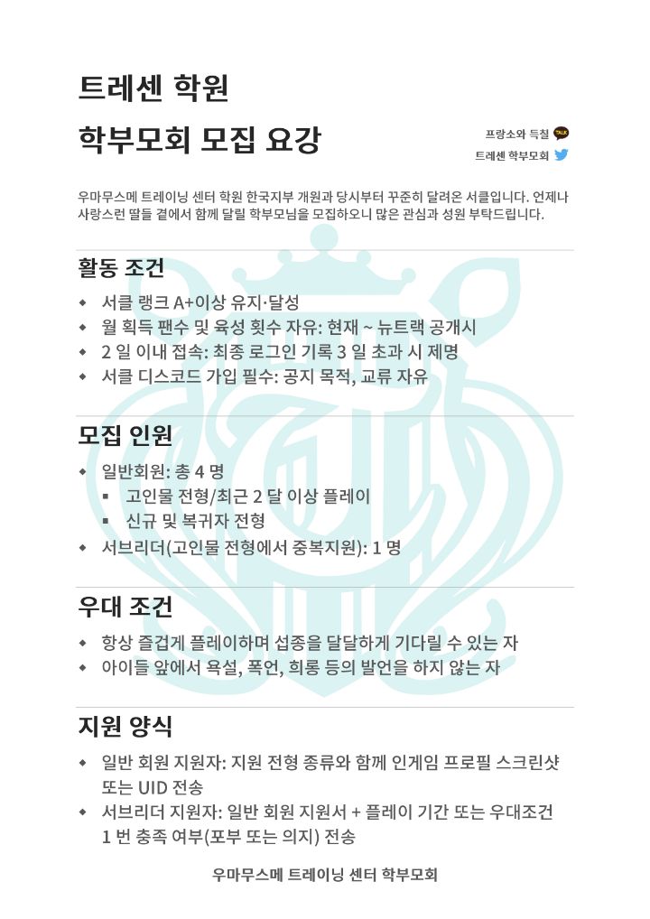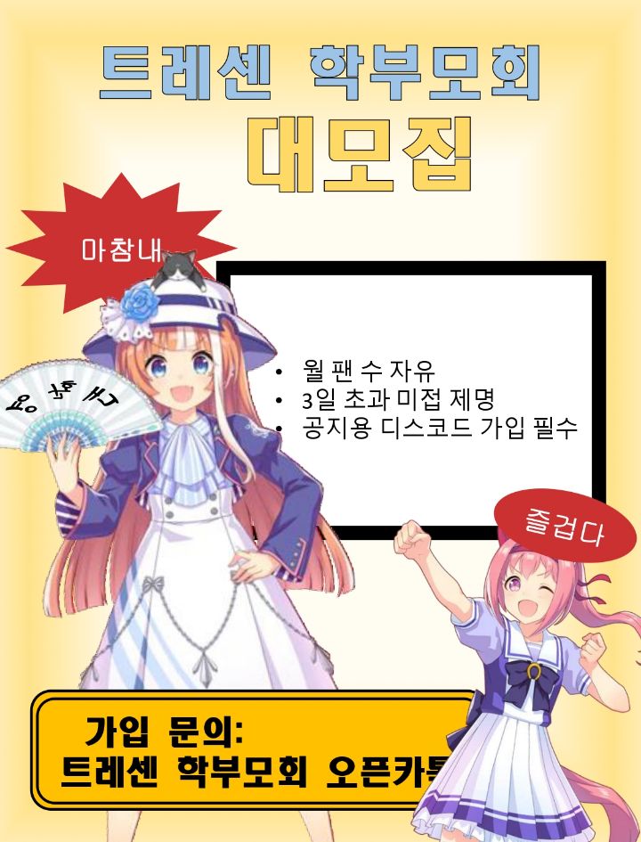 [모집]마참내! 서클원 대모집 작성자득칠|작성시간23.05.02|조회수176 목록 댓글 0 글자크기 작게가 글자크기 크게가 서클에서 숨만 쉬어도 당근 1800개가 자연발생할 수 있다고 생각한 적이 있습니까??일어날 수 있으니 각오해라A+ 서클 트레센학부모회 서클원 대모집!!사진을 터치하여 지원 접수 다음검색 현재 게시글 추가 기능 열기 북마크 공유하기 신고 센터로 신고 댓글 댓글 0 댓글쓰기 답글쓰기 댓글 리스트