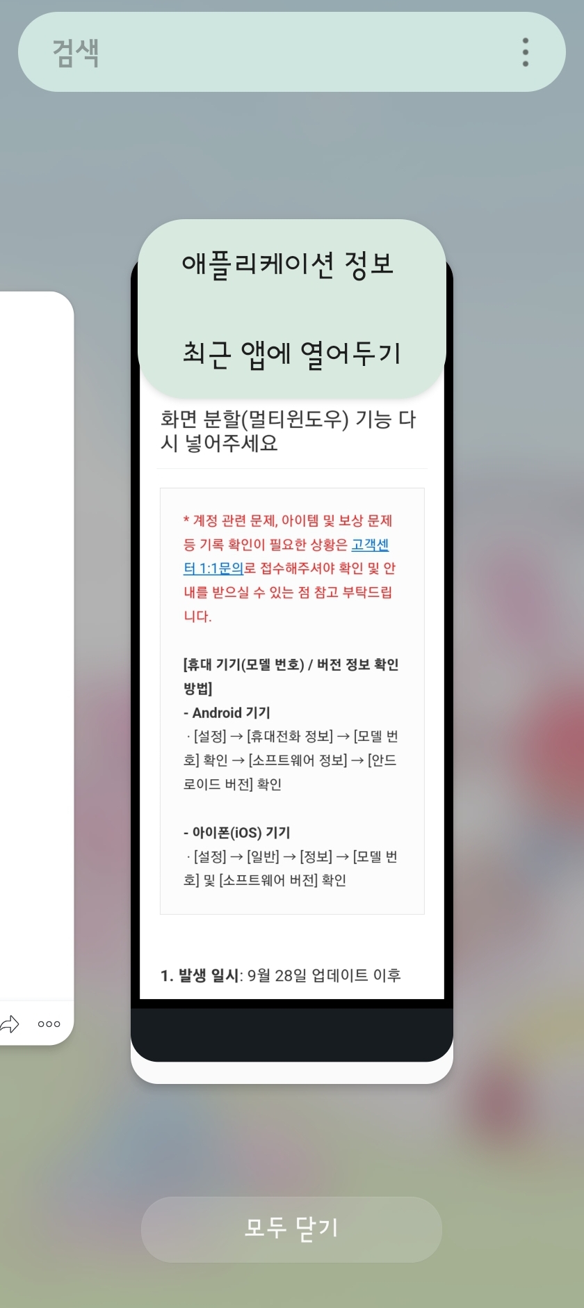 안드로이드 기기에서 잘 되던 화면분할 (멀티윈도우) 기능이 업데이트 후 갑자기 사라짐