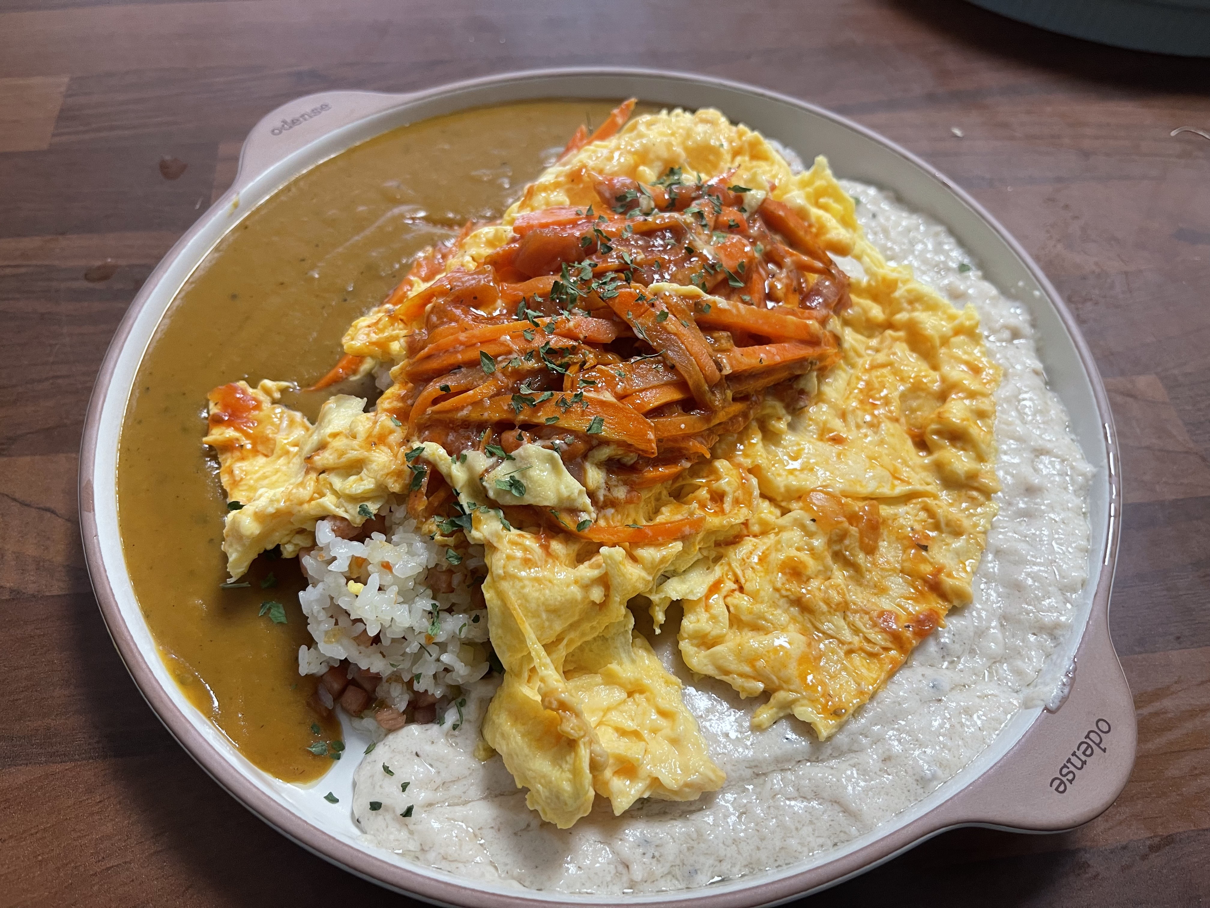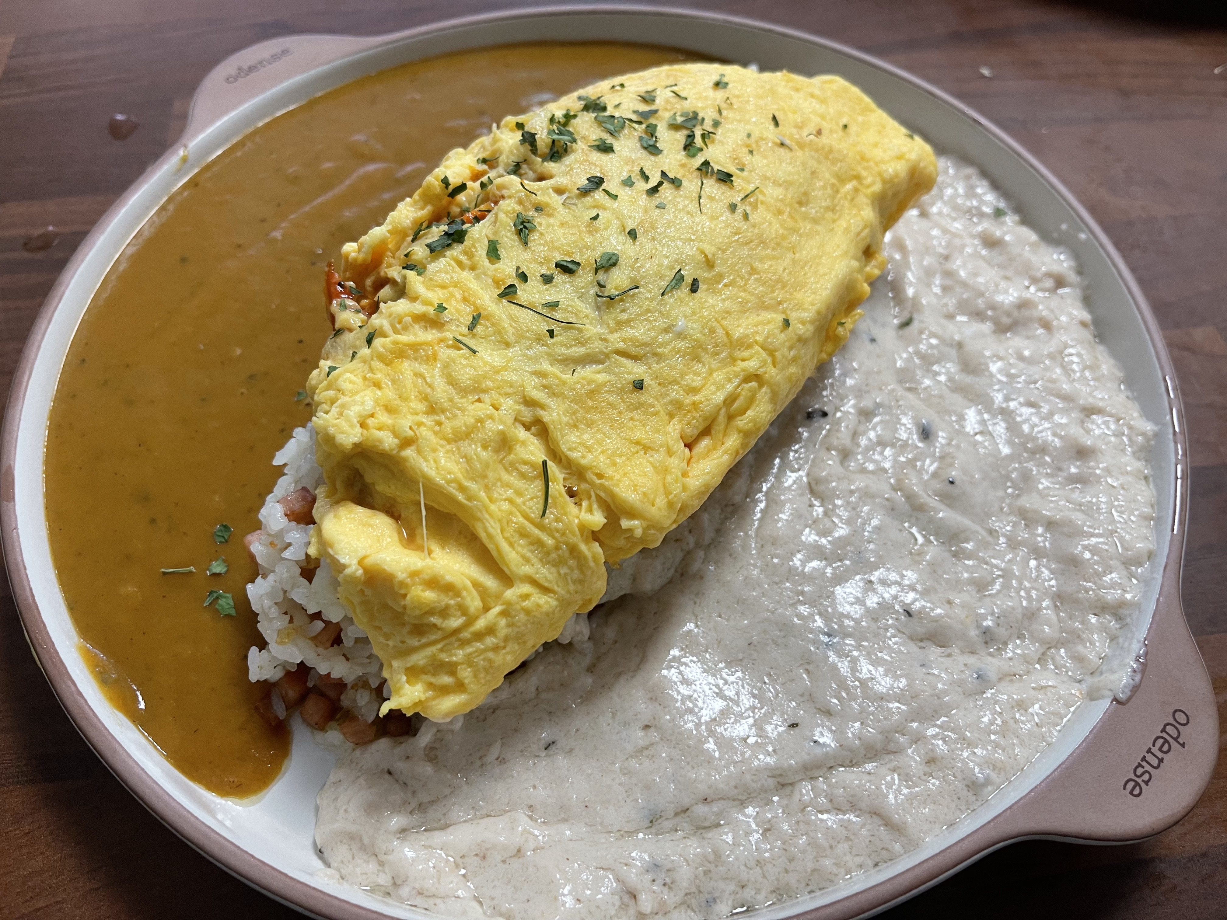 오믈렛을 볶음밥에 올린 뒤, 카레소스와 베사밀소스로 데코를 해줍시다