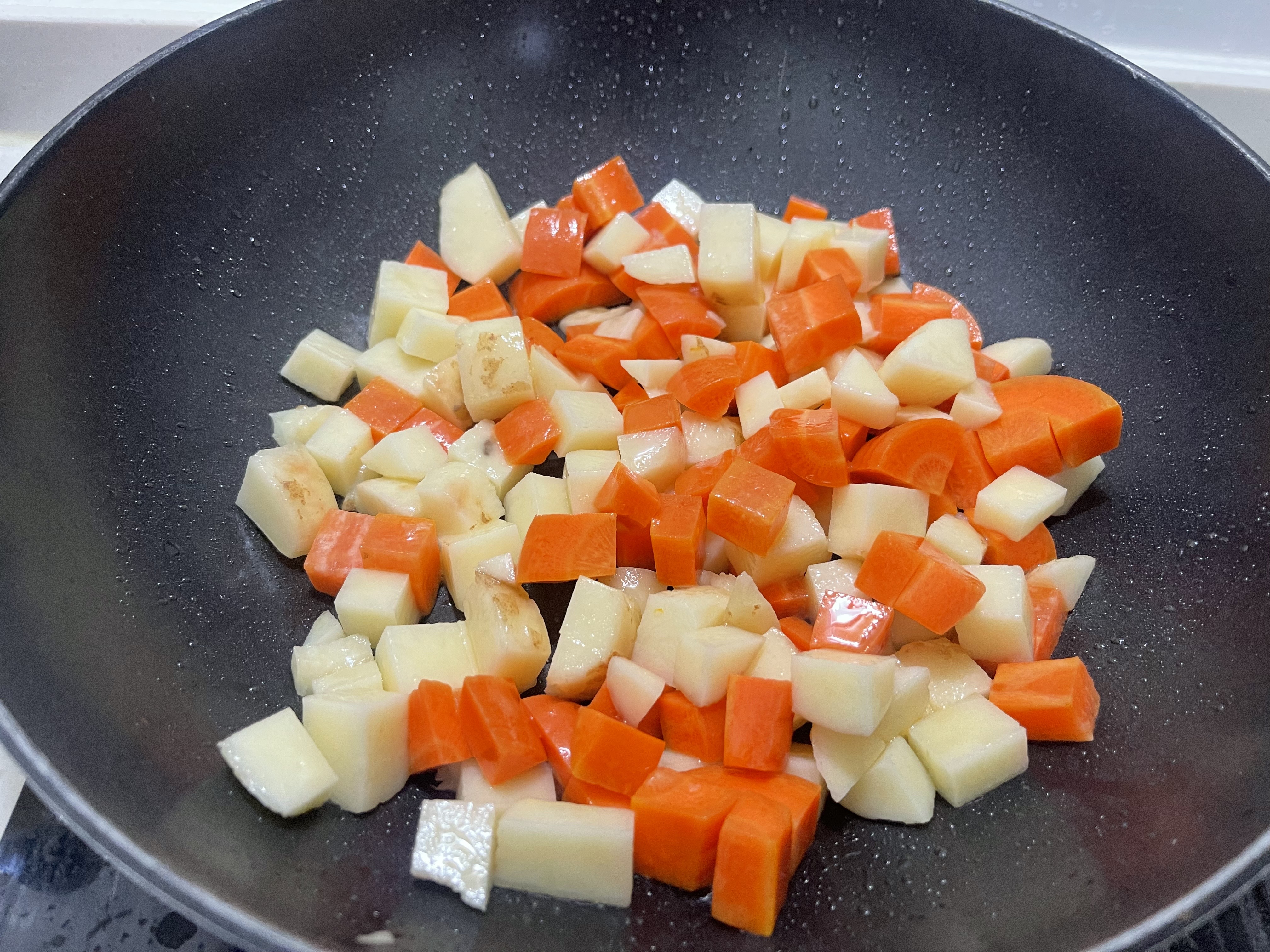 잘 씻은 감자와 당근을 싹뚝썰기를 한 다음에 볶습니다.