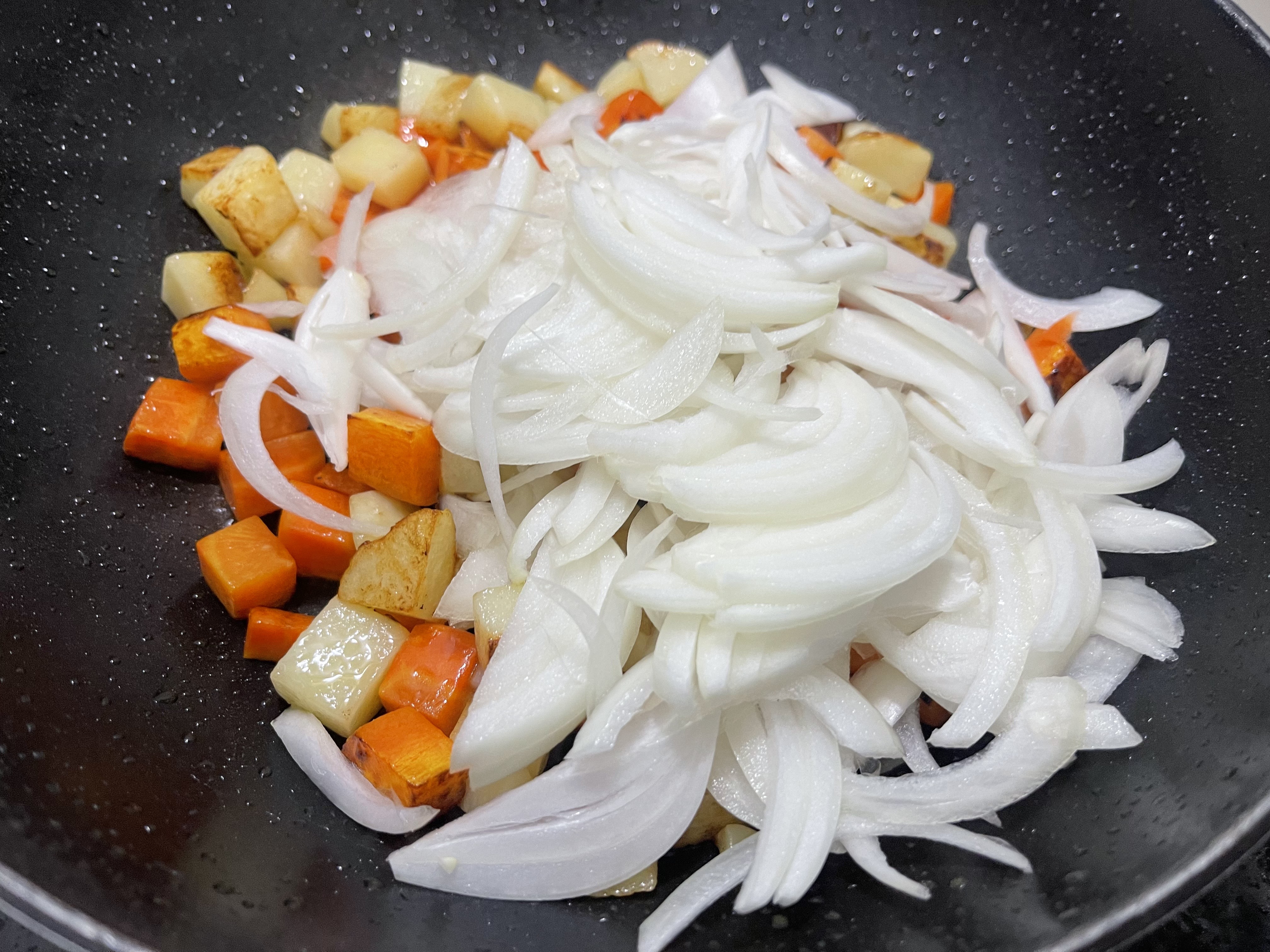 볶은 감자와 당근 위에 양파도 같이 썰어서 볶아줍니다