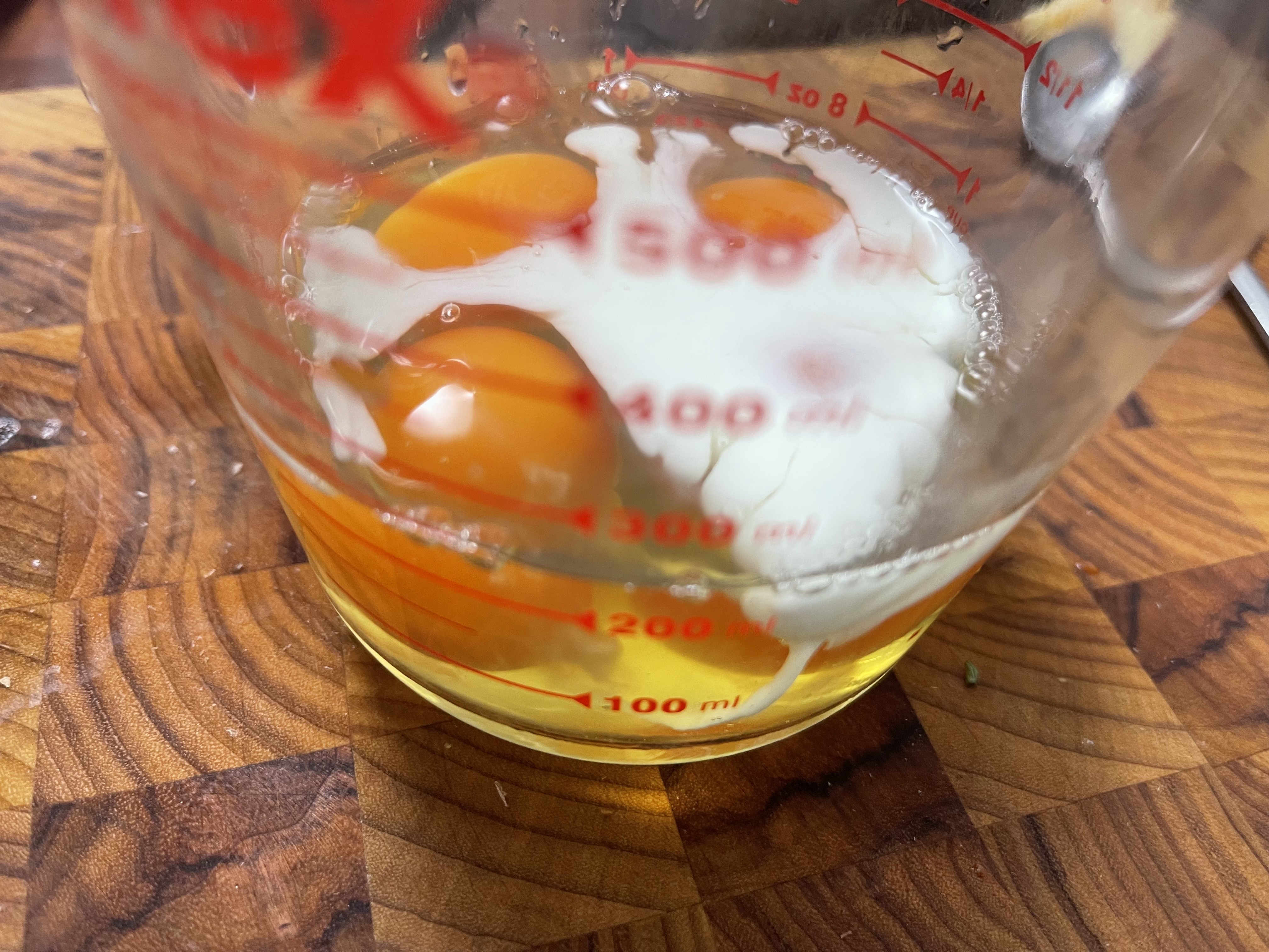오믈렛을 만들기 위해 계란과 우유를 섞어줍니다