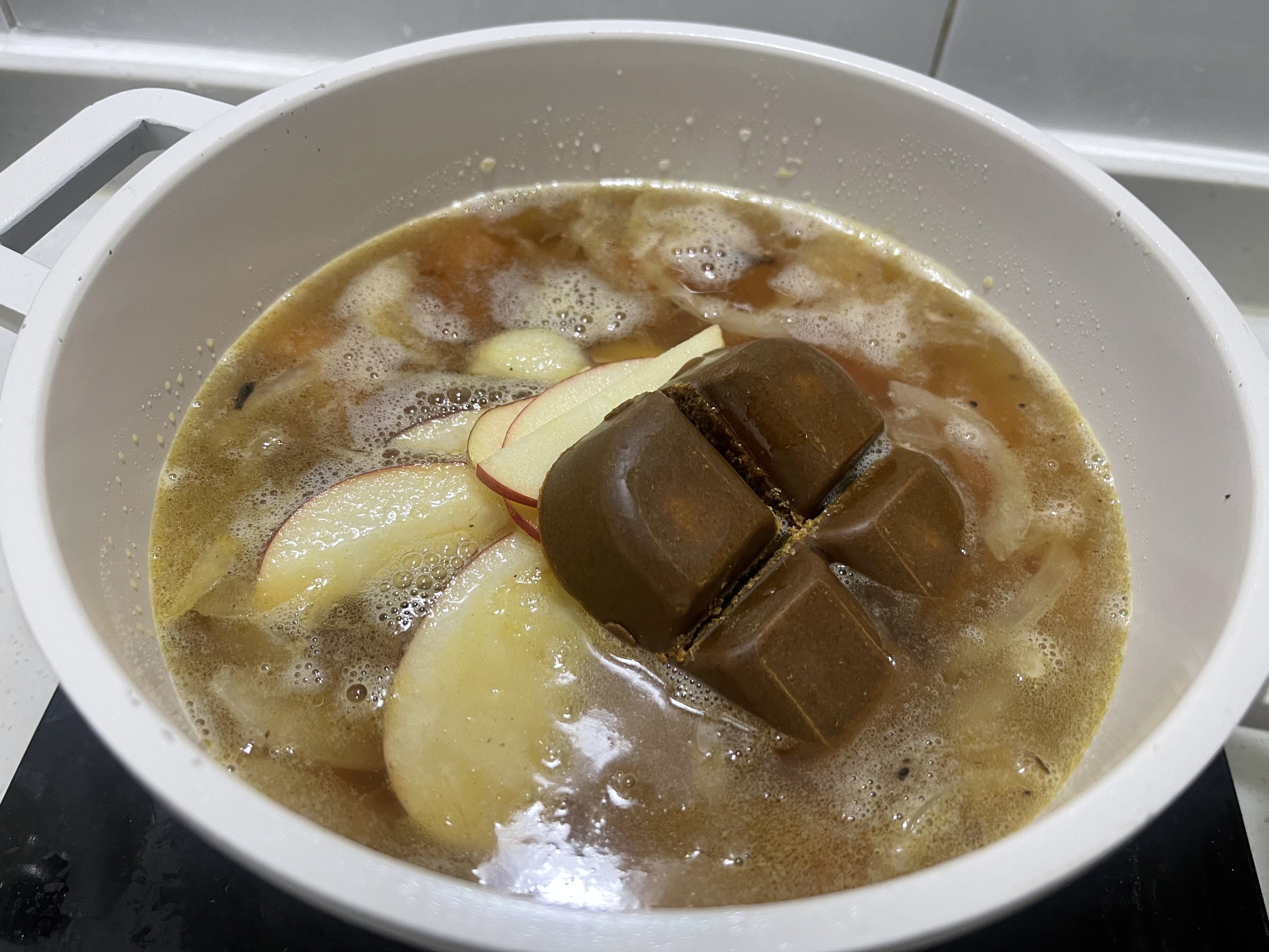 볶은 야채들을 물과 얇게 썬 사과 그리고 고형카레를 함께 넣어 끓여줍니다.