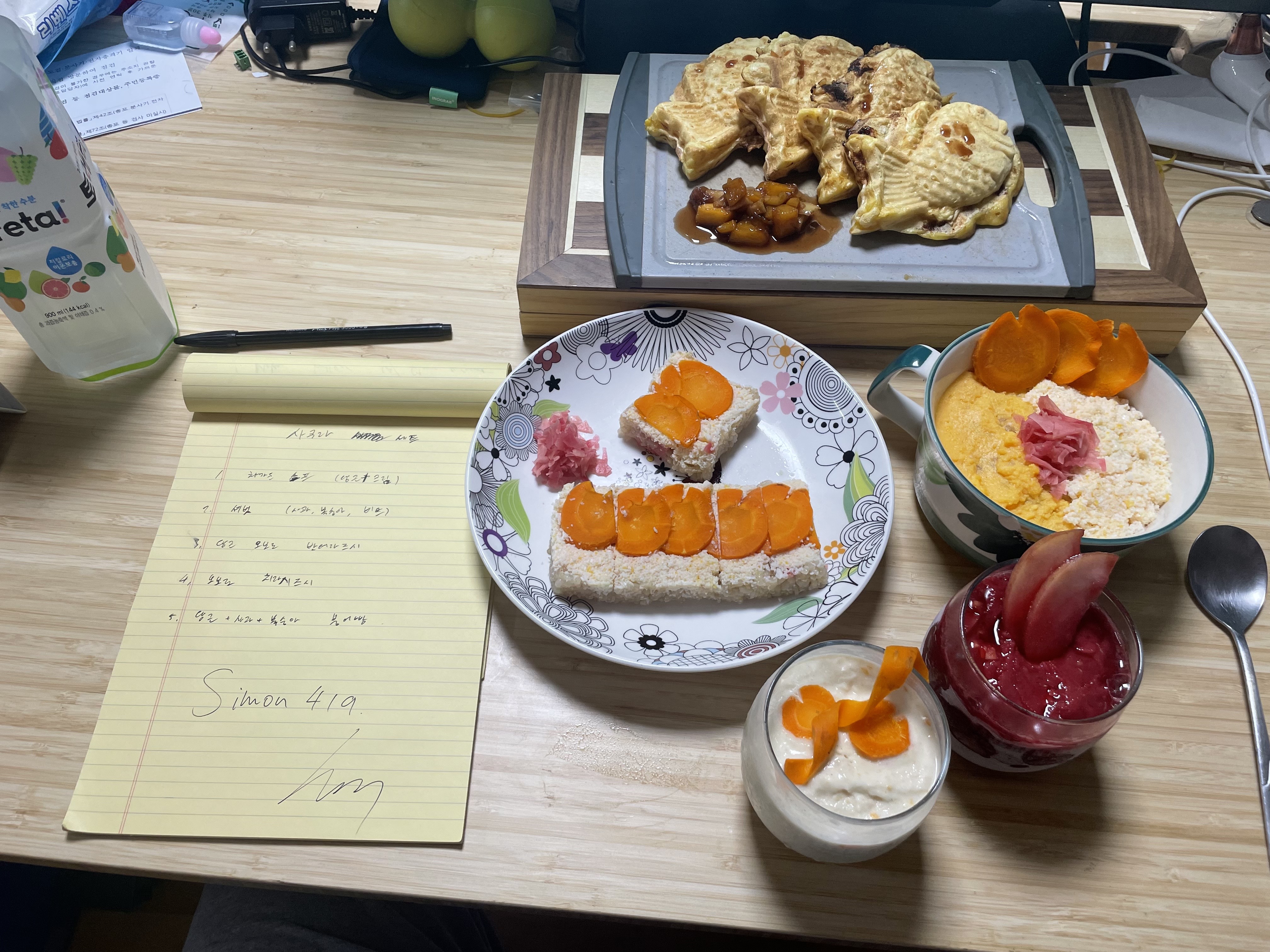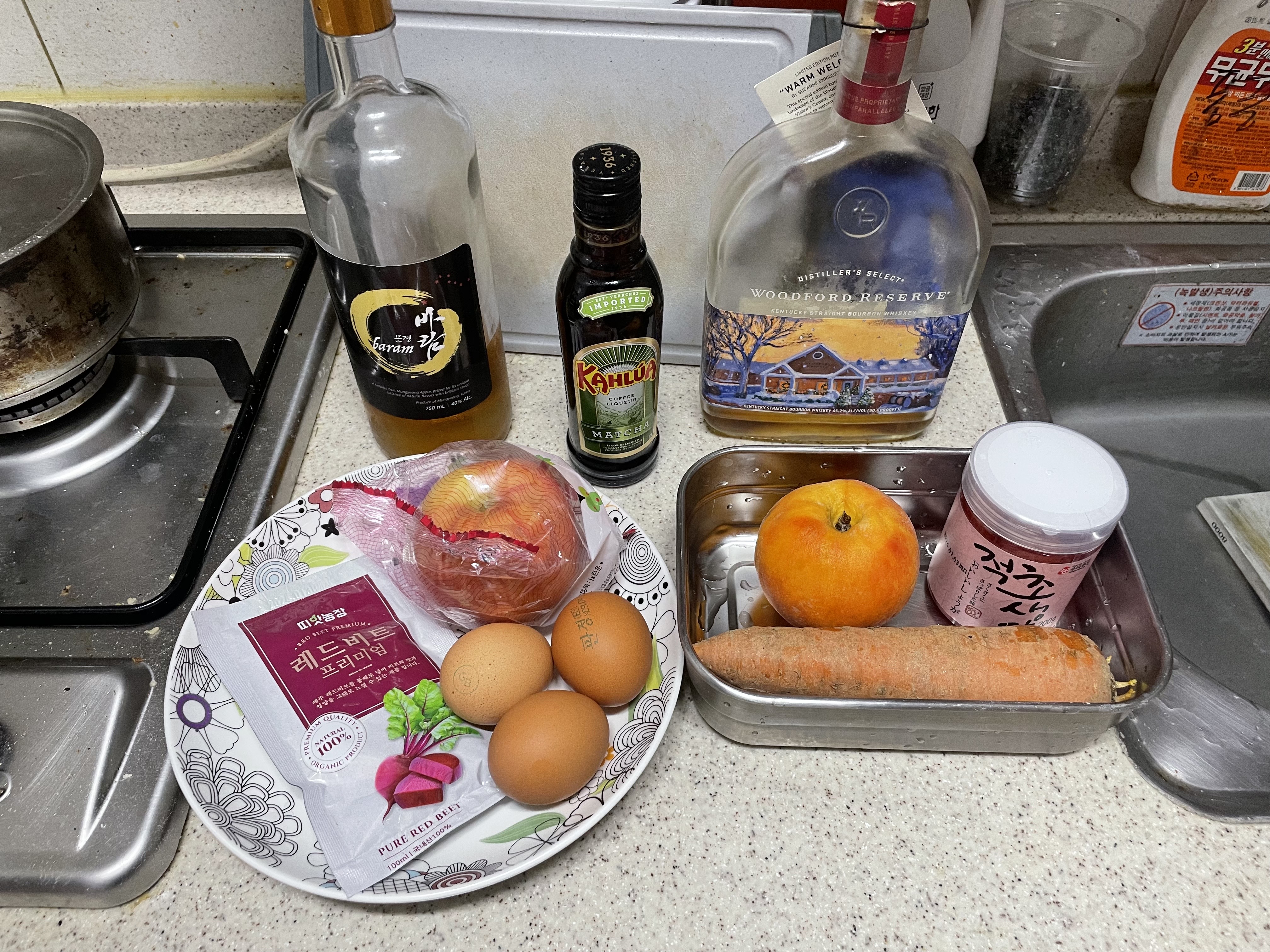 이 5종류의 요리는 당근1개, 사과1개, 복숭아1개, 삶은계란 3개, 현미햇반2개, 비트즙 100미리, 위스키, 사과증류술, 초생강, 설탕, 밀가루, 간장, 식초, 소금이 사용되었습니다
