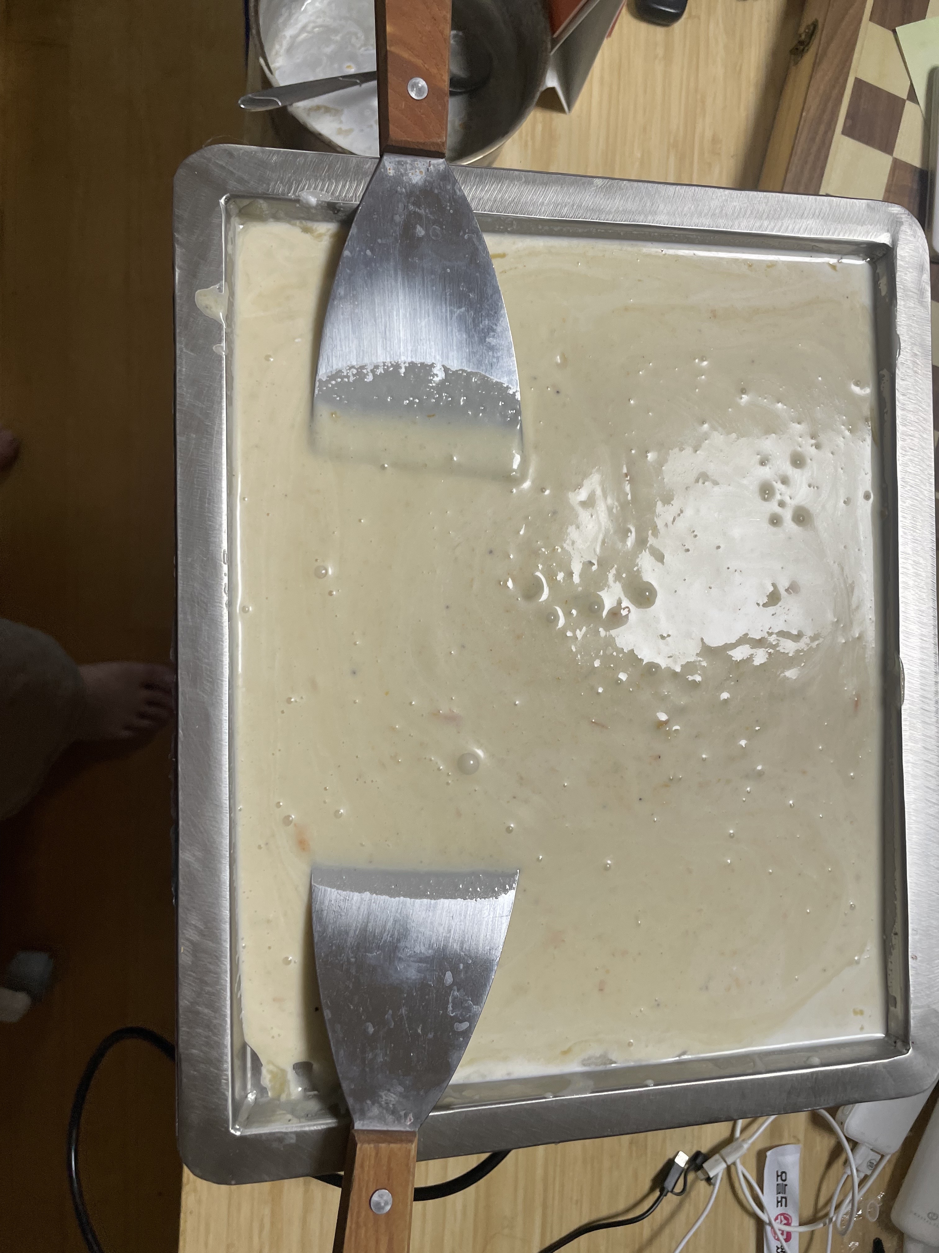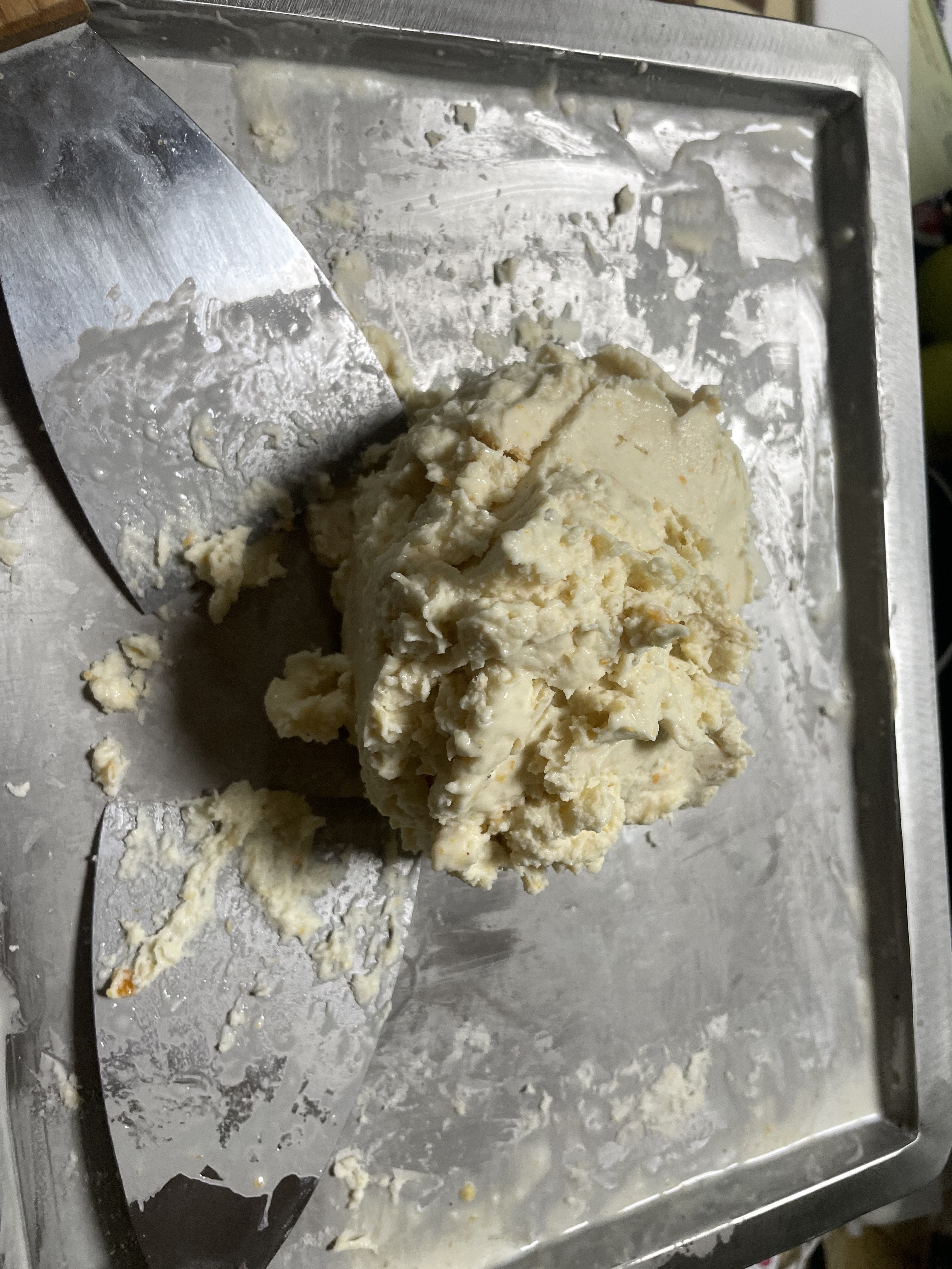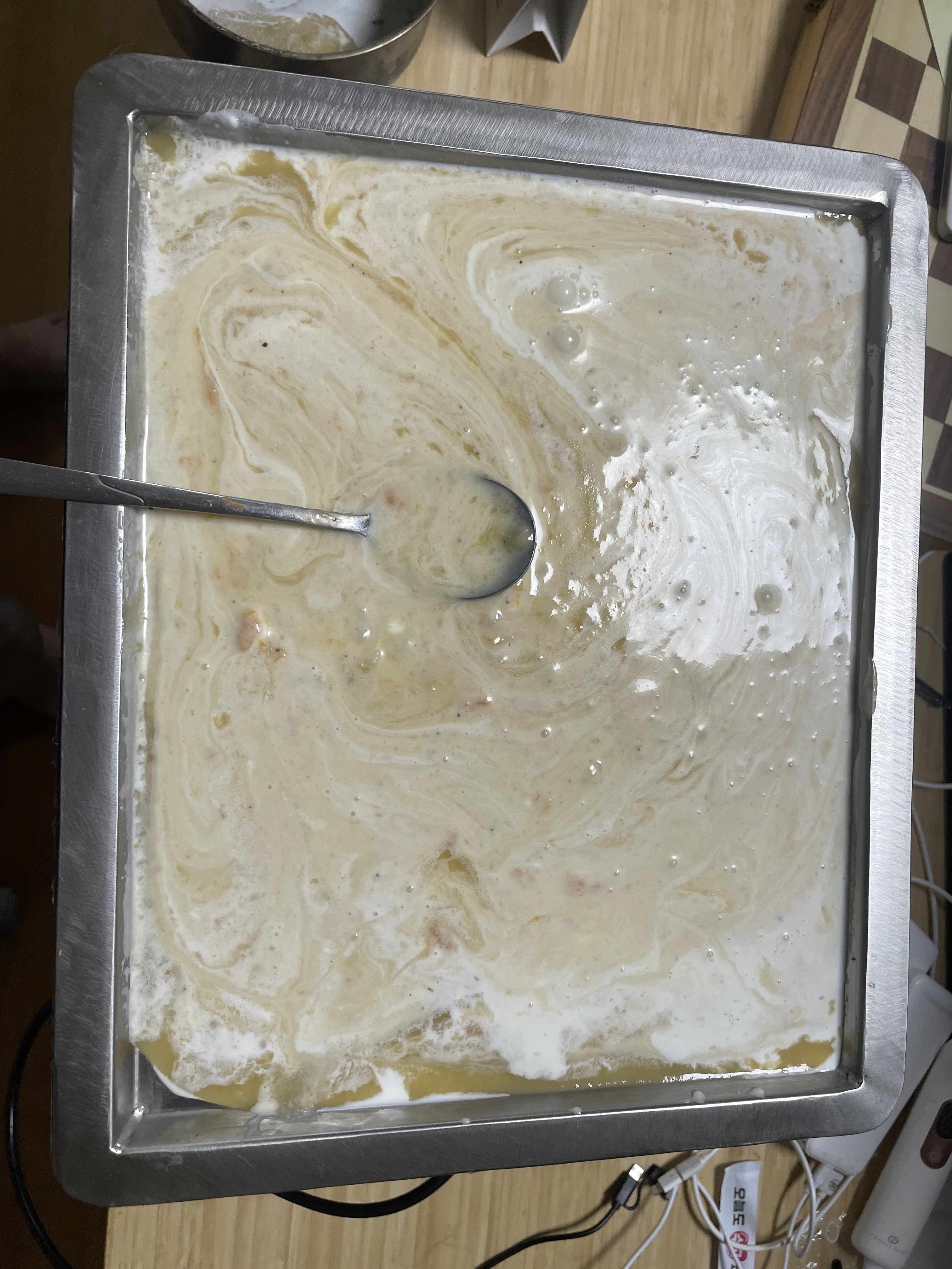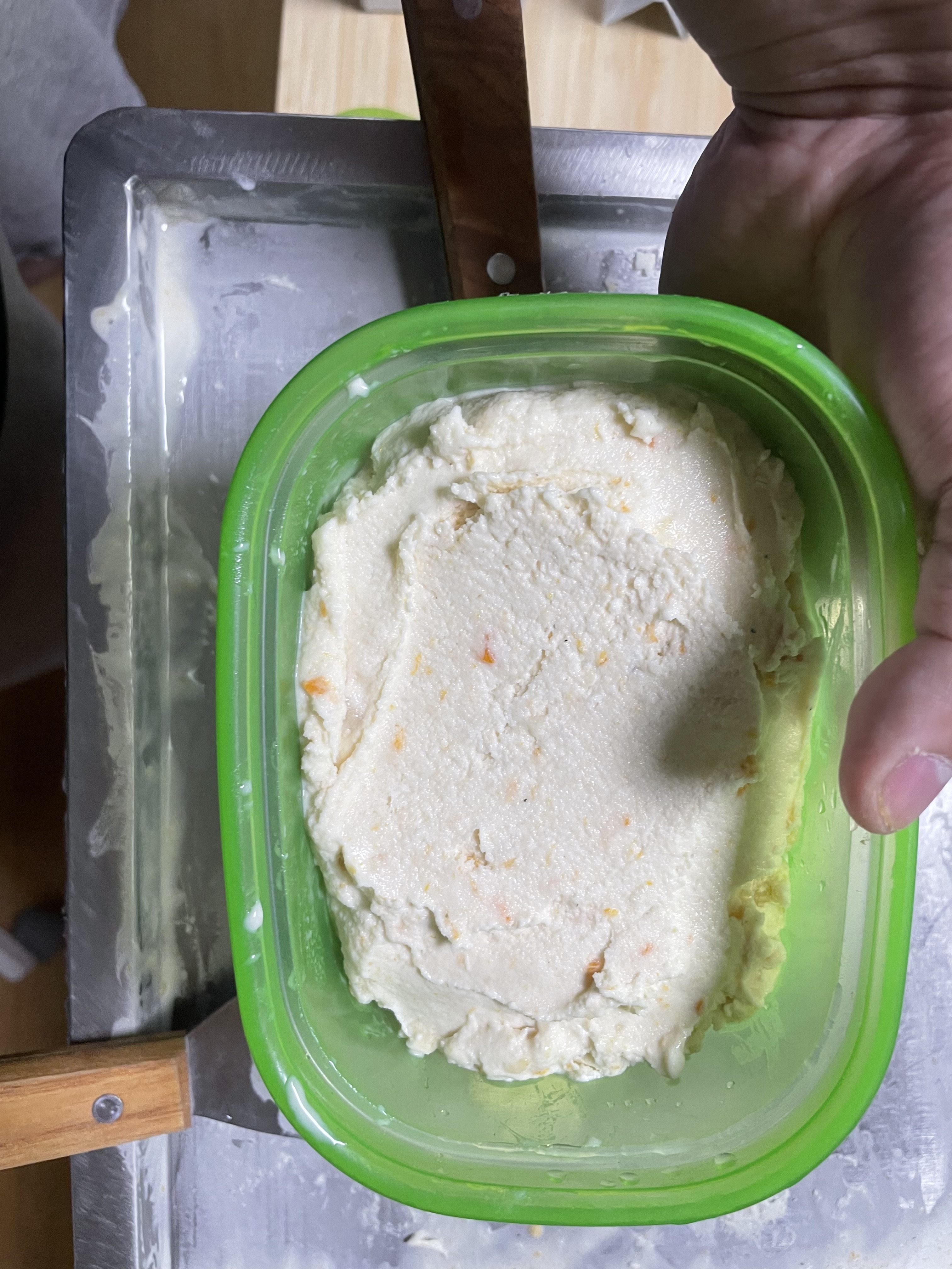 찬 틀에 두고 (저의 경우 철판 아이스크림 기계) 생크림을 섞으며 응고시킵니다