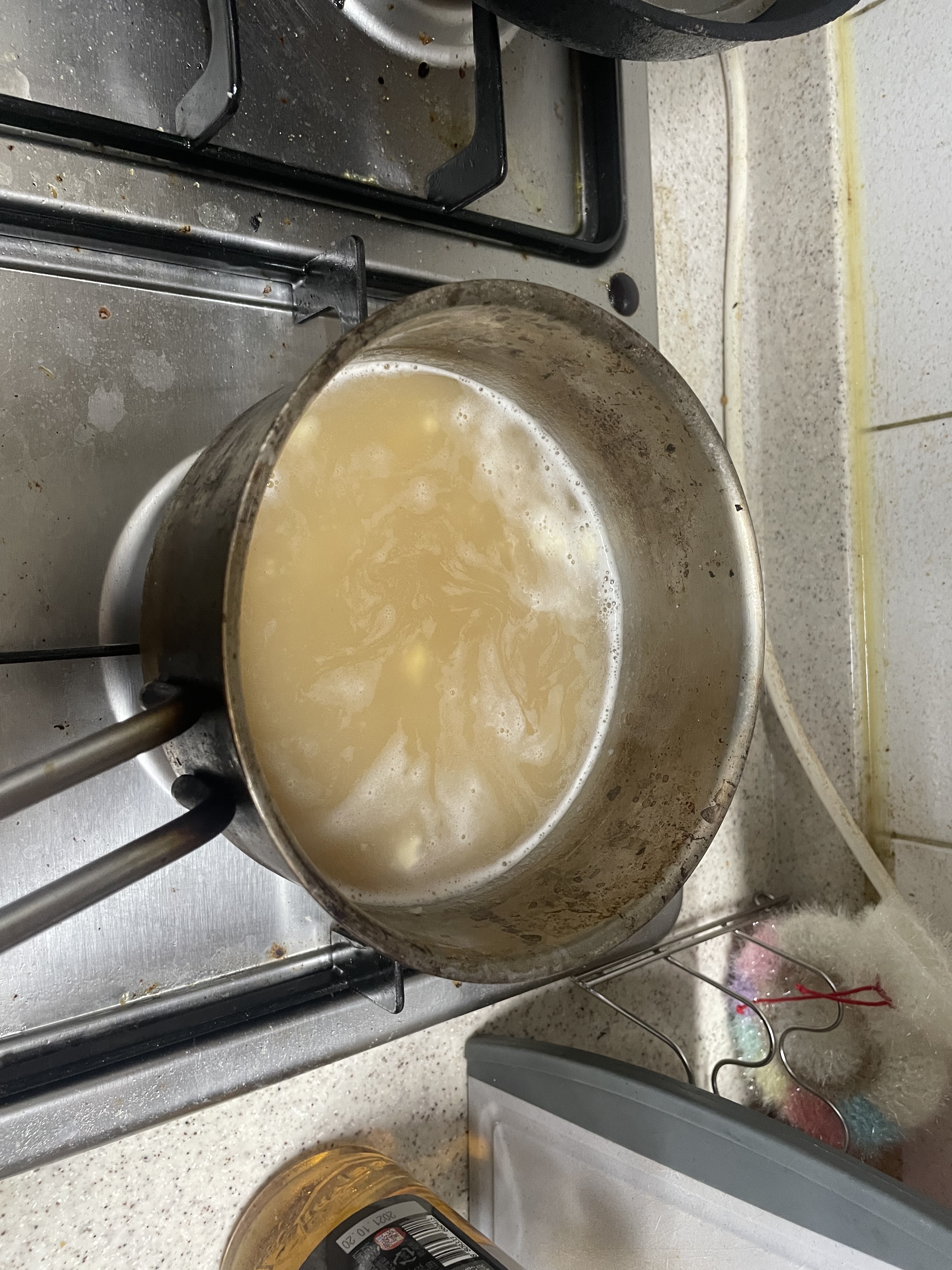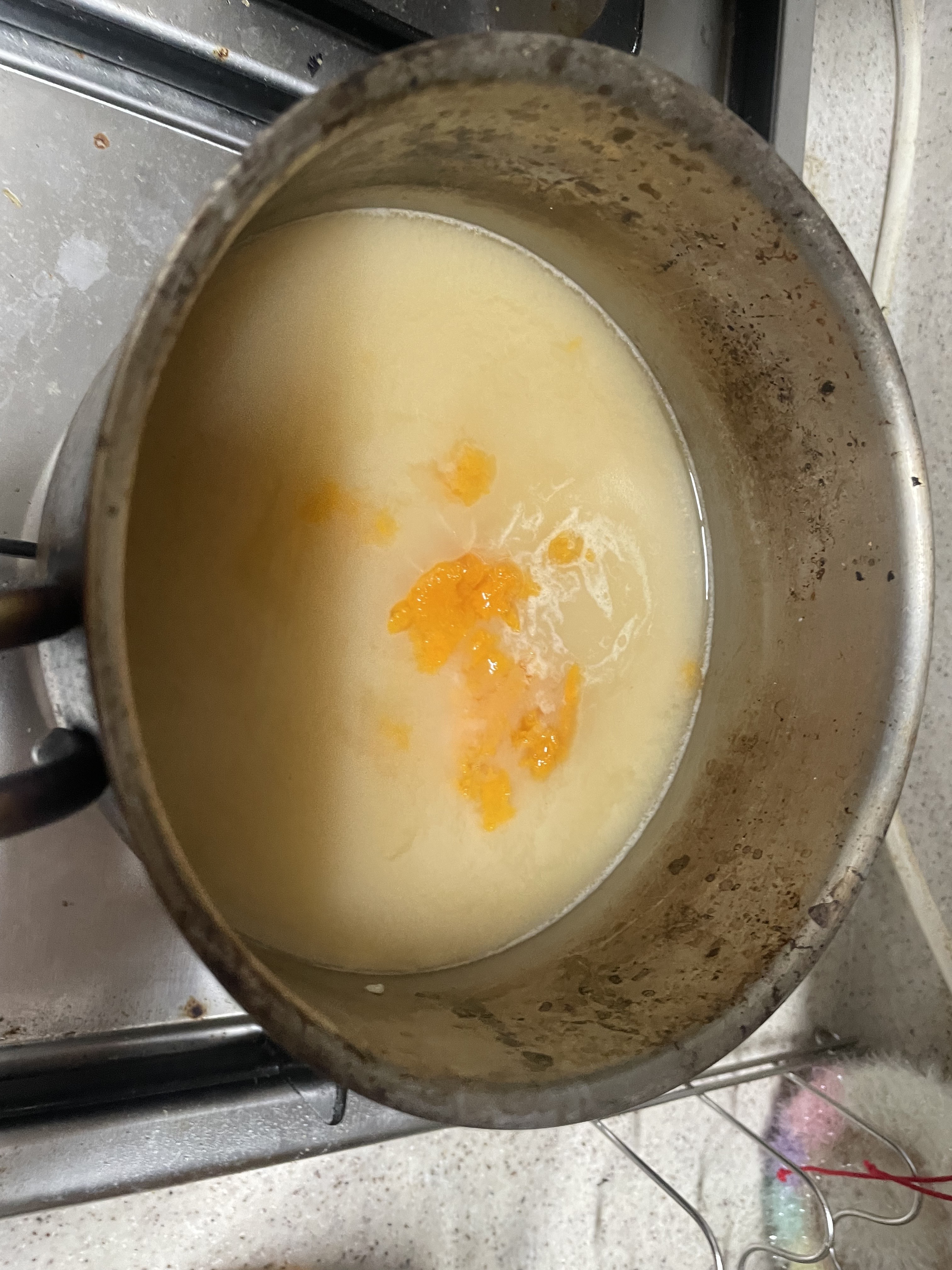 육수가 적당히 나오면 물이 녹색으로 변합니다. 그때 당근을 꺼내고 소량의 밀가루와 간장, 후추, 소금으로 간을 합니다