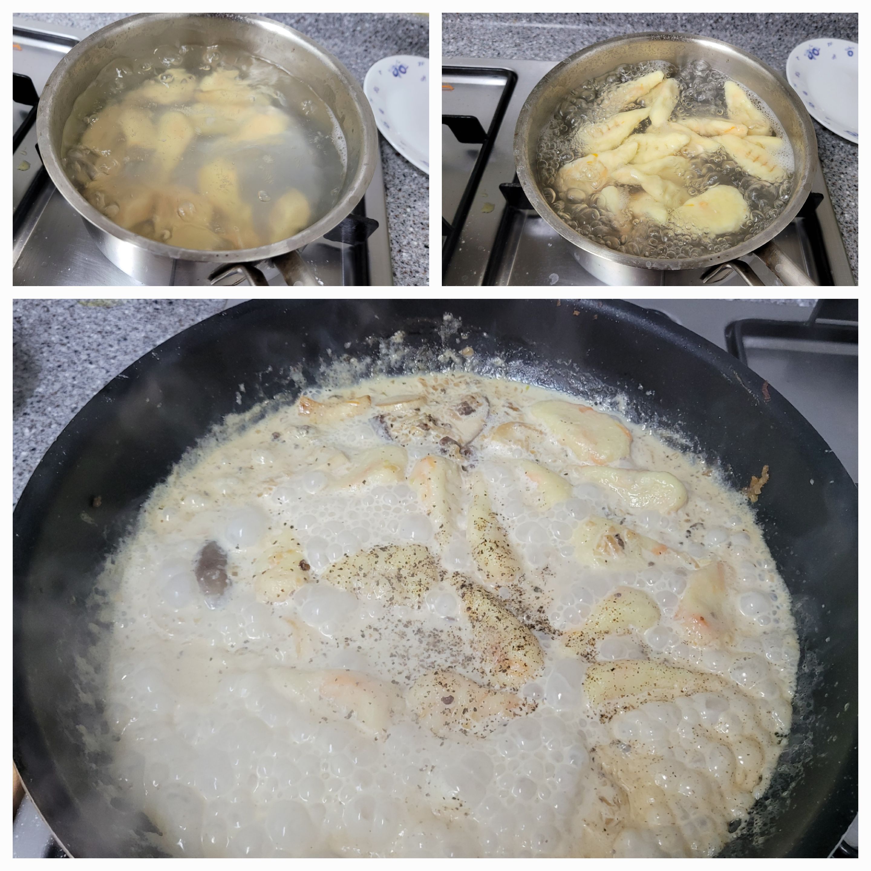 삶겨진 뇨끼를 넣고 졸여서 마무리합니다.