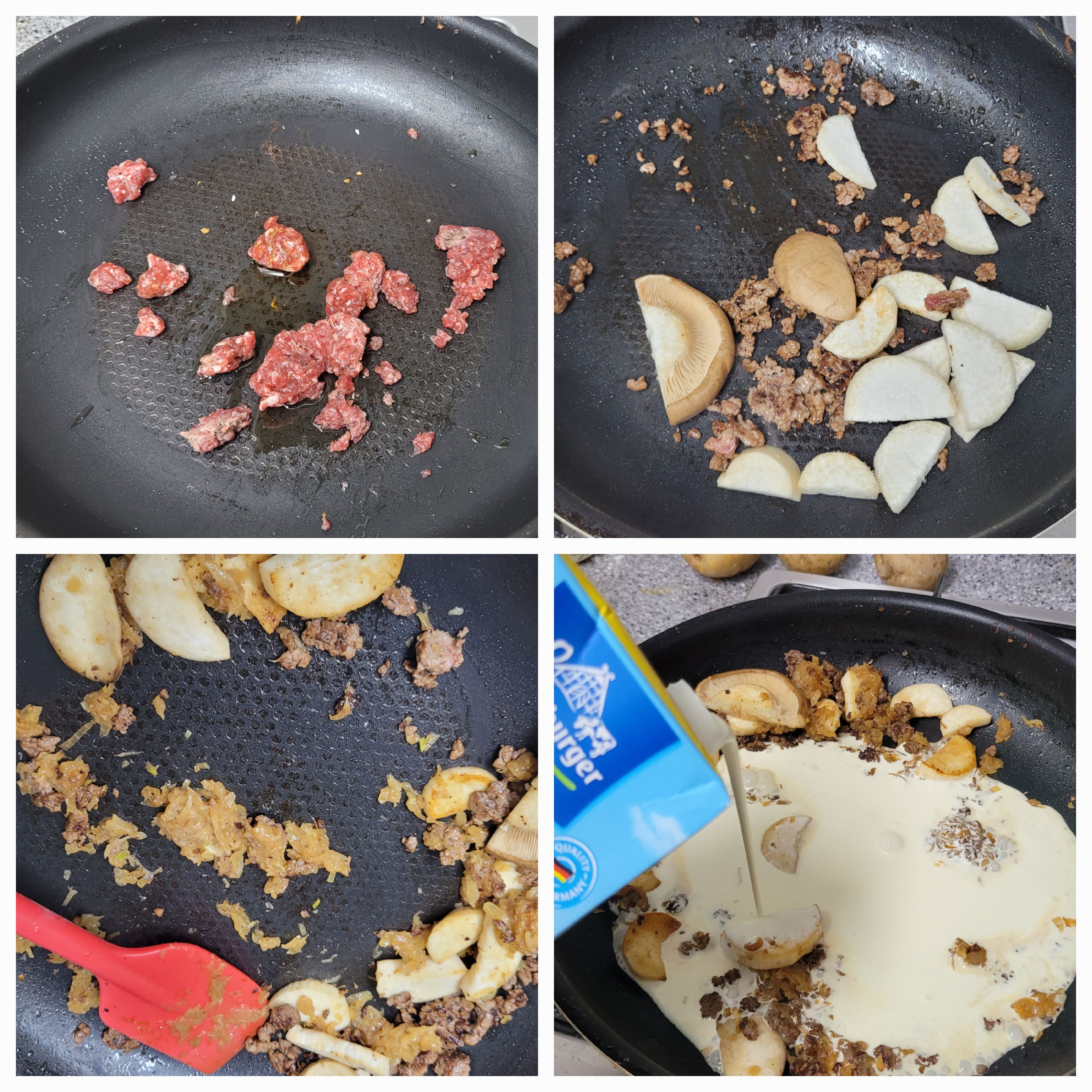 볶은 소고기와 버섯, 감자, 크림, 트러플, 치즈