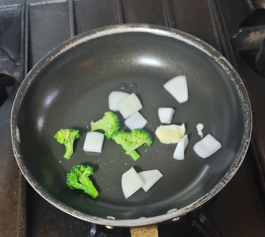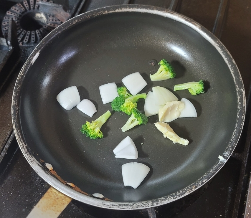 이번에도 불 위에 버터를 1/4 숟가락 정도 올려주고, 이제는 익숙하실 브로콜리와 양파도 몇조각 넣고~