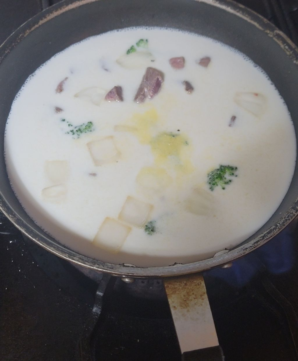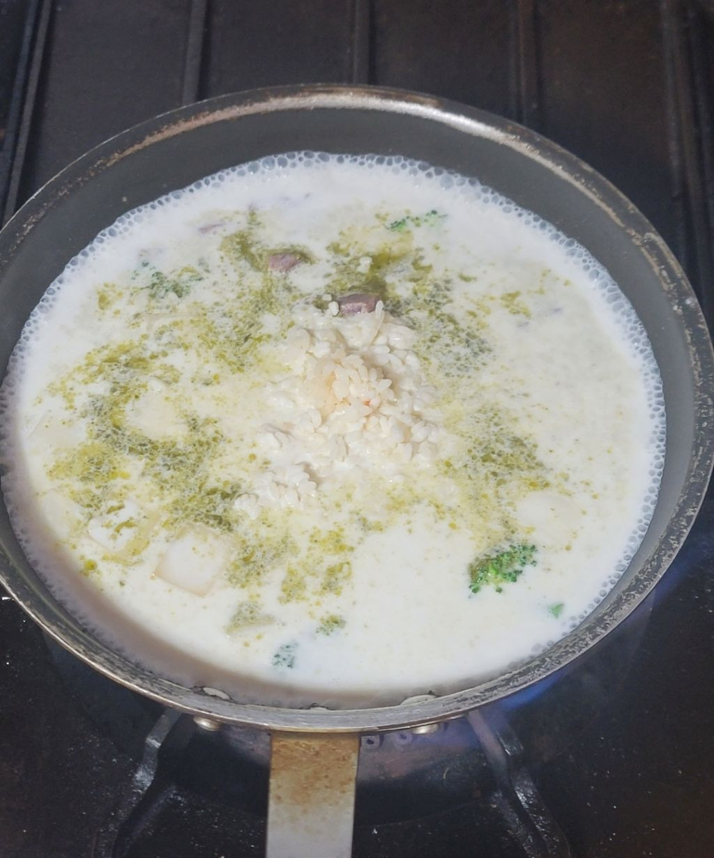치킨스톡을 희석한 닭고기 국물 한 국자, 우유 한 국자를 부워줍니다. 닭고기 국물은 치킨스톡을 아주 조금! 한 티스푼 정도 넣고, 물을 500g 부어 섞어주면 됩니다.