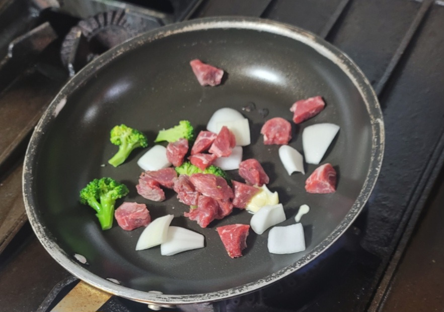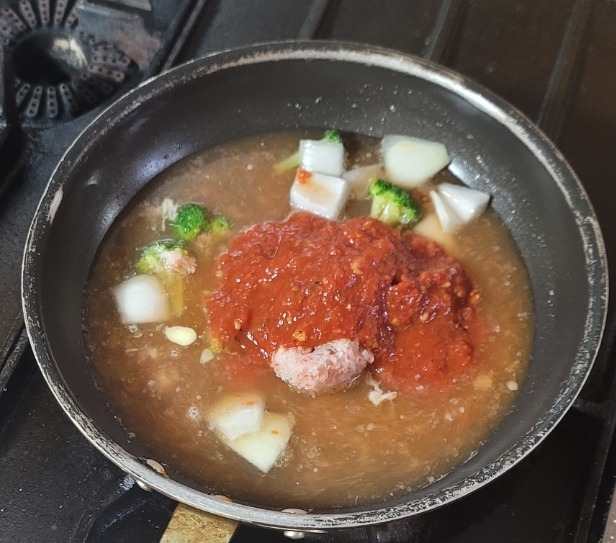미리 냉동실에서 꺼내 해동하던 소고기 역시 잘 녹아있길래 먹기 좋게 썰어 넣어줍니다.