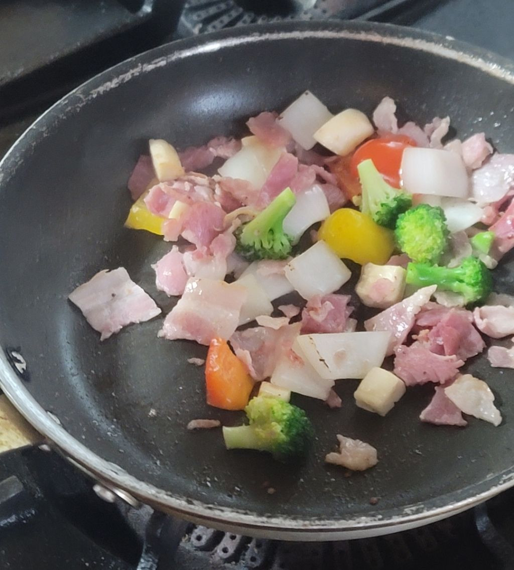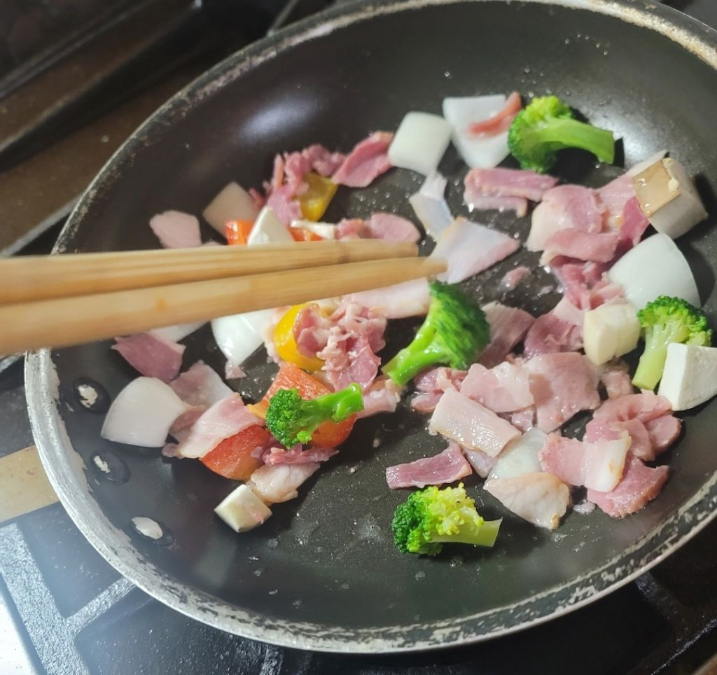 채소들이 살짝 익었다면 잘게 자른 베이컨 투하!