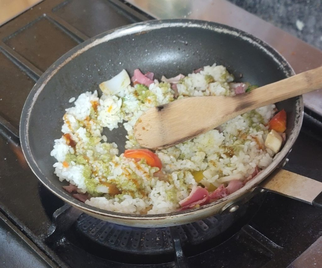 버섯이 연한 갈색이 될때까지 익혀주고 나면 밥을 넣고, 취향껏 굴소스와 바질 페스토를 뿌려줍니다.
