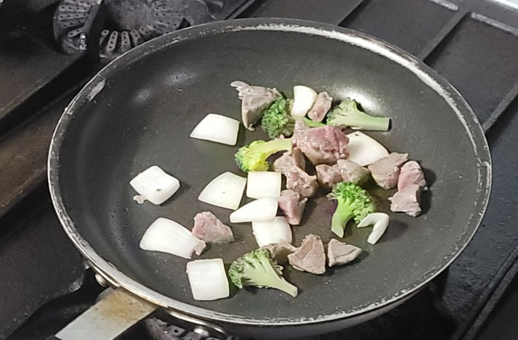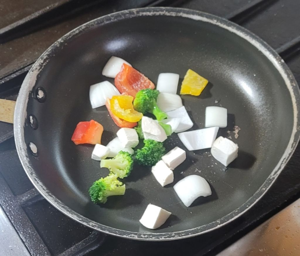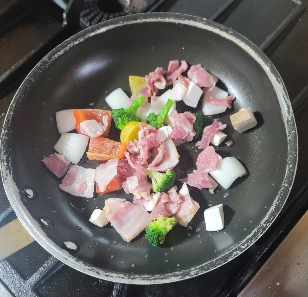 우선 불 위에 올린 후라이팬에 올리브유를 한바퀴 둘러줍니다. 기름이 뜨거워지면, 적당한 크기로 썰어준 양파 한주먹, 버섯 한주먹, 파프리카와 브로콜리 5조각을 먼저 넣고 구워주세요.