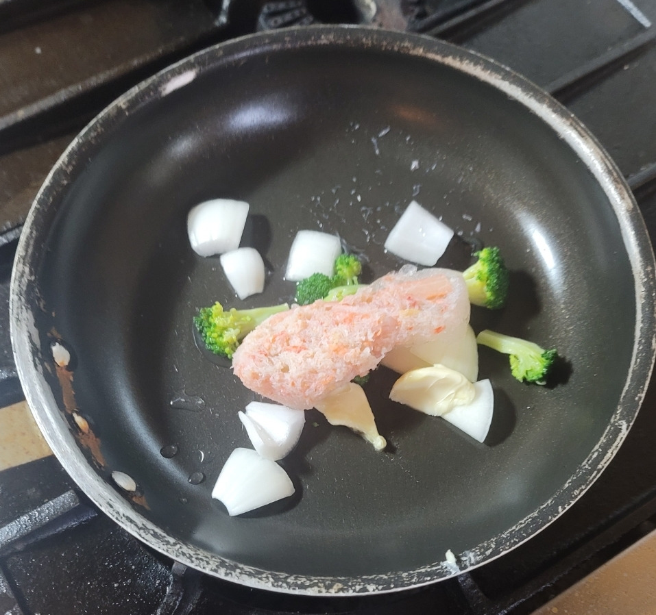 채소만 있으면 아쉬우니, 냉동실에 있던 게살을 조금 꺼내줍니다.