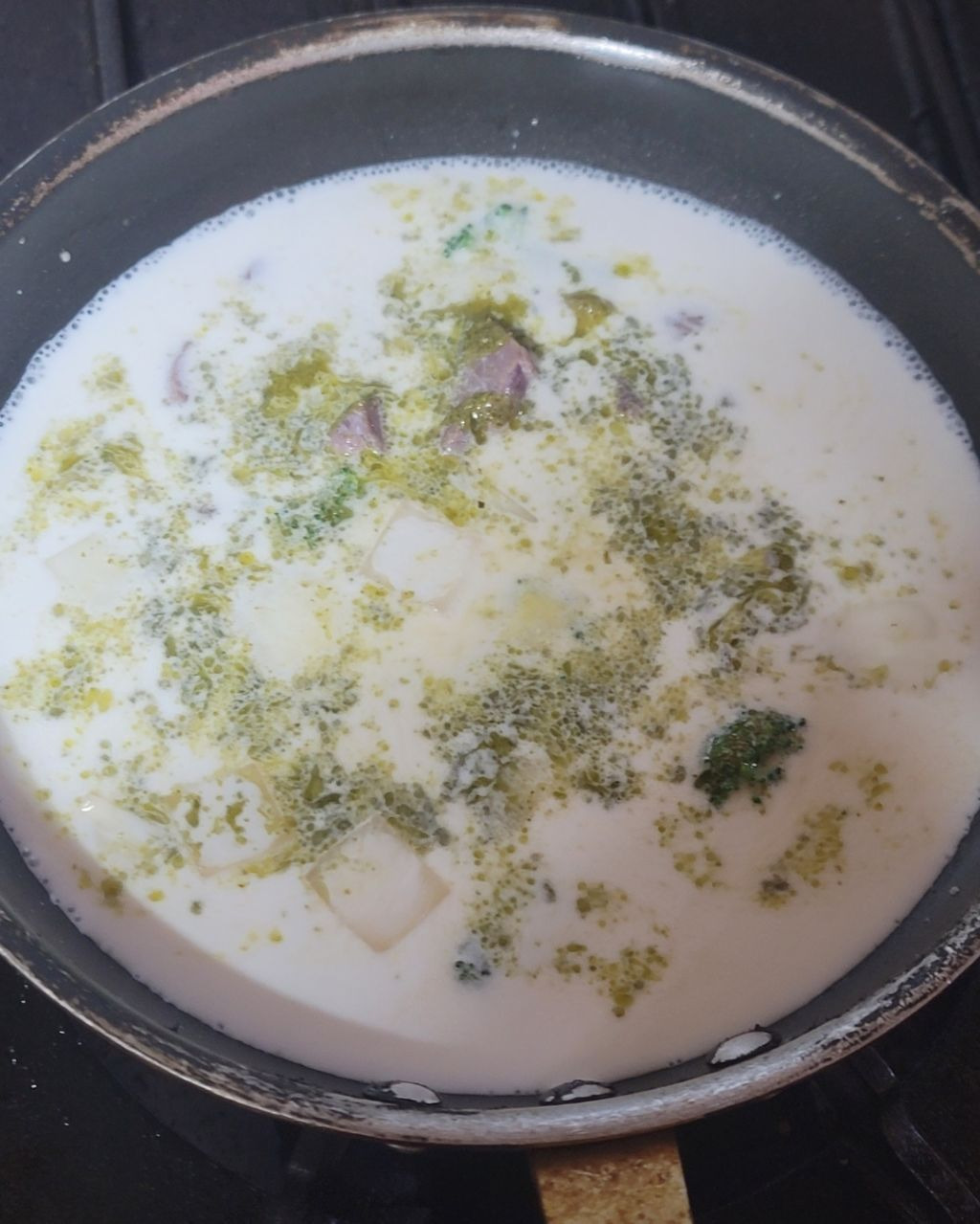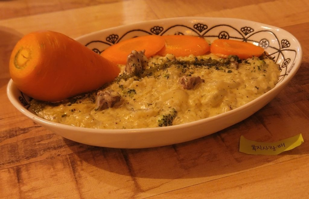 -버터, 양파, 브로콜리, 소고기, 우유, 닭고기 국물, 밥, 바질, 소금 조금, (아까 쓰고 남은) 당근
